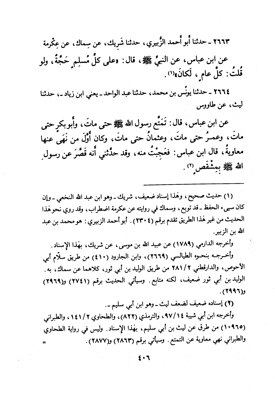 ٢٦٦٤ - حَدَّثَنَا يُونُسُ بْنُ مُحَمَّدٍ، حَدَّثَنَا عَبْدُ الْوَاحِدِ يَعْنِي ابْنَ زِيَادٍ، حَدَّثَنَا لَيْثٌ، عَنْ طَاوُسٍ، عَنِ ابْنِ عَبَّاسٍ، قَالَ: " تَمَتَّعَ رَسُولُ اللهِ صَلَّى اللهُ عَلَيْهِ وَسَلَّمَ حَتَّى مَاتَ " وَأَبُو بَكْرٍ حَتَّى مَاتَ، وَعُمَرُ حَتَّى مَاتَ، وَعُثْمَانُ حَتَّى مَاتَ، وَكَانَ أَوَّلَ مَنْ نَهَى عَنْهَا مُعَاوِيَةُ، قَالَ ابْنُ عَبَّاسٍ: فَعَجِبْتُ مِنْهُ وَقَدْ حَدَّثَنِي أَنَّهُ " قَصَّرَ عَنْ رَسُولِ اللهِ صَلَّى اللهُ عَلَيْهِ وَسَلَّمَ بِمِشْقَصٍ " (٢)