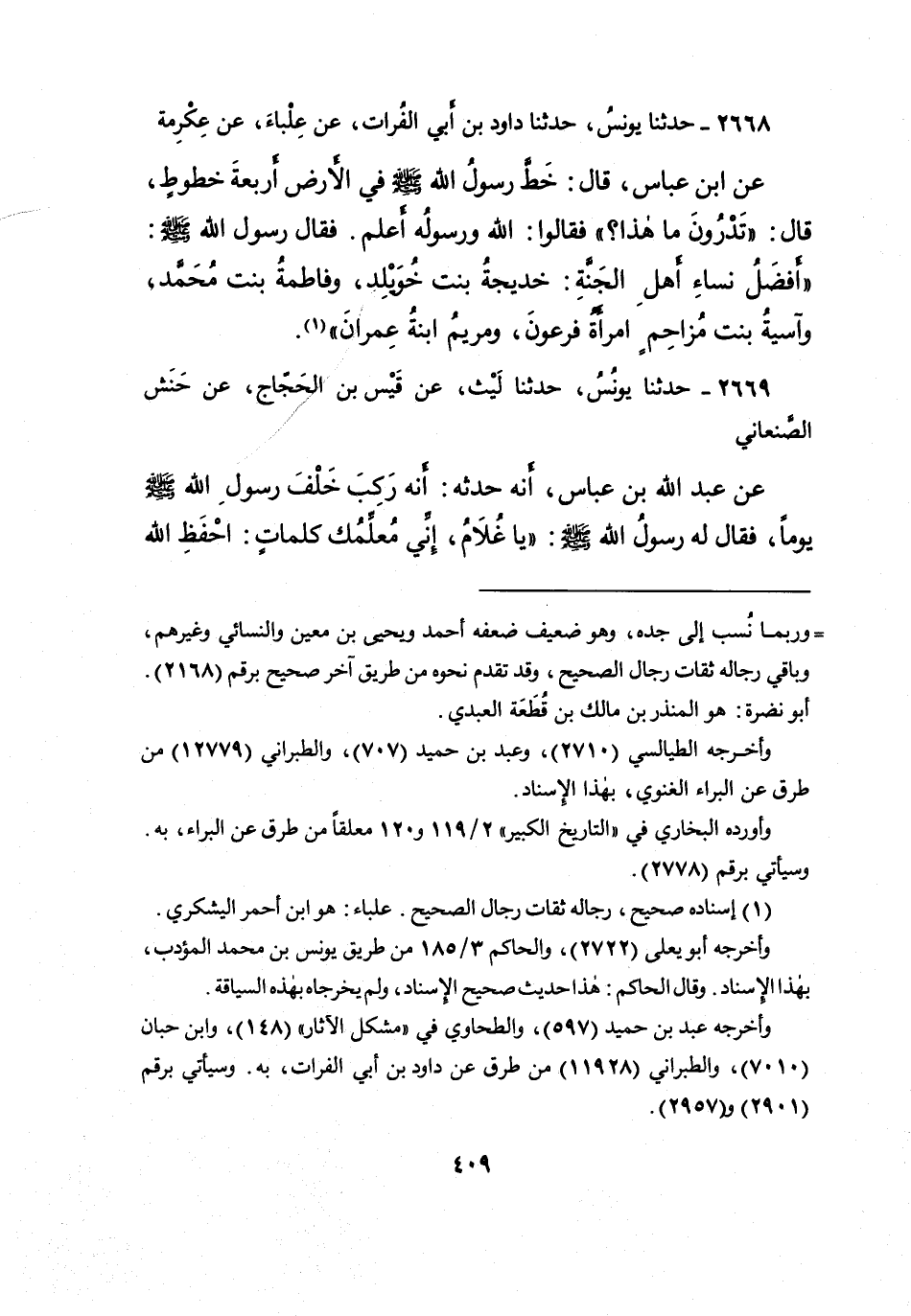 ٢٦٦٨ - حَدَّثَنَا يُونُسُ، حَدَّثَنَا دَاوُدُ بْنُ أَبِي الْفُرَاتِ، عَنْ عِلْبَاءَ، عَنْ عِكْرِمَةَ، عَنِ ابْنِ عَبَّاسٍ، قَالَ: خَطَّ رَسُولُ اللهِ صَلَّى اللهُ عَلَيْهِ وَسَلَّمَ فِي الْأَرْضِ أَرْبَعَةَ خُطُوطٍ، قَالَ: " تَدْرُونَ مَا هَذَا؟ " فَقَالُوا: اللهُ وَرَسُولُهُ أَعْلَمُ. فَقَالَ رَسُولُ اللهِ صَلَّى اللهُ عَلَيْهِ وَسَلَّمَ: " أَفْضَلُ نِسَاءِ أَهْلِ الْجَنَّةِ: خَدِيجَةُ بِنْتُ خُوَيْلِدٍ، وَفَاطِمَةُ بِنْتُ مُحَمَّدٍ، وَآسِيَةُ بِنْتُ مُزَاحِمٍ امْرَأَةُ فِرْعَوْنَ، وَمَرْيَمُ ابْنَةُ عِمْرَانَ " (١)