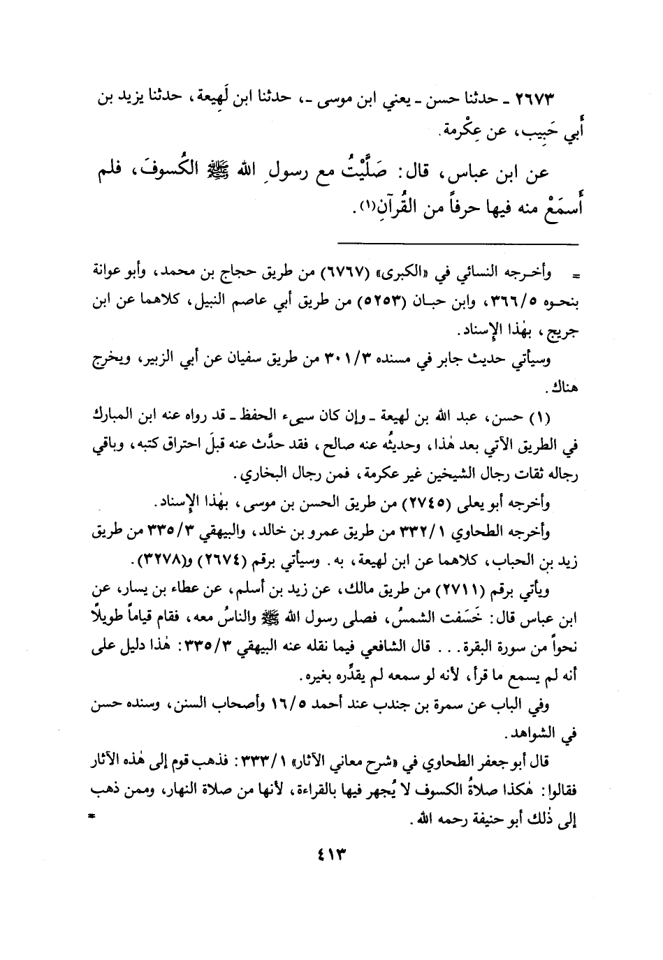 ٢٦٧٣ - حَدَّثَنَا حَسَنٌ يَعْنِي ابْنَ مُوسَى، حَدَّثَنَا ابْنُ لَهِيعَةَ، حَدَّثَنَا يَزِيدُ بْنُ أَبِي حَبِيبٍ، عَنْ عِكْرِمَةَ، عَنِ ابْنِ عَبَّاسٍ، قَالَ: " صَلَّيْتُ مَعَ رَسُولِ اللهِ صَلَّى اللهُ عَلَيْهِ وَسَلَّمَ الْكُسُوفَ، فَلَمْ أَسْمَعْ مِنْهُ فِيهَا حَرْفًا مِنَ القُرْآنِ " (١)