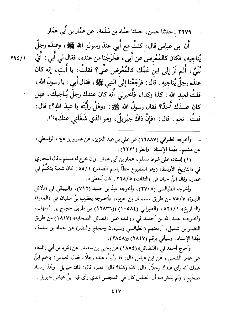 ٢٦٧٩ - حَدَّثَنَا حَسَنٌ، حَدَّثَنَا حَمَّادُ بْنُ سَلَمَةَ، عَنْ عَمَّارِ بْنِ أَبِي عَمَّارٍ، أَنَّ ابْنَ عَبَّاسٍ، قَالَ: كُنْتُ مَعَ أَبِي عِنْدَ رَسُولِ اللهِ صَلَّى اللهُ عَلَيْهِ وَسَلَّمَ، وَعِنْدَهُ رَجُلٌ يُنَاجِيهِ، فَكَانَ كَالْمُعْرِضِ عَنْ أَبِي، فَخَرَجْنَا مِنْ عِنْدِهِ، فَقَالَ لِي أَبِي: أَيْ بُنَيَّ، أَلَمْ تَرَ إِلَى ابْنِ عَمِّكَ كَالْمُعْرِضِ عَنِّي؟ فَقُلْتُ: يَا أَبَتِ، إِنَّهُ كَانَ عِنْدَهُ رَجُلٌ يُنَاجِيهِ. قَالَ: فَرَجَعْنَا إِلَى النَّبِيِّ صَلَّى اللهُ عَلَيْهِ وَسَلَّمَ، فَقَالَ أَبِي: يَا رَسُولَ اللهِ، قُلْتُ لِعَبْدِ اللهِ: كَذَا وَكَذَا، فَأَخْبَرَنِي أَنَّهُ كَانَ عِنْدَكَ رَجُلٌ يُنَاجِيكَ، فَهَلْ كَانَ عِنْدَكَ أَحَدٌ؟ فَقَالَ رَسُولُ اللهِ صَلَّى اللهُ عَلَيْهِ وَسَلَّمَ: " وَهَلْ رَأَيْتَهُ يَا عَبْدَ اللهِ؟ " قَالَ: قُلْتُ: نَعَمْ. قَالَ: " فَإِنَّ ذَاكَ جِبْرِيلُ، وَهُوَ الَّذِي شَغَلَنِي عَنْكَ " (١)