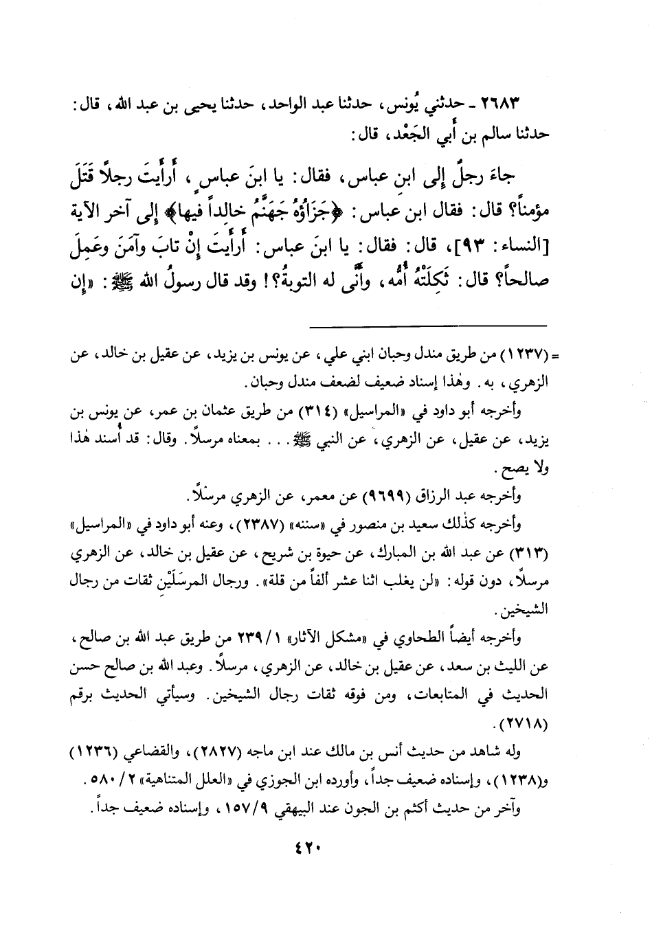 ٢٦٨٣ - حَدَّثَنَا يُونُسُ، حَدَّثَنَا عَبْدُ الْوَاحِدِ، حَدَّثَنَا يَحْيَى بْنُ عَبْدِ اللهِ، قَالَ: حَدَّثَنَا سَالِمُ بْنُ أَبِي الْجَعْدِ، قَالَ: جَاءَ رَجُلٌ إِلَى ابْنِ عَبَّاسٍ، فَقَالَ: يَا ابْنَ عَبَّاسٍ، أَرَأَيْتَ رَجُلًا قَتَلَ مُؤْمِنًا؟ قَالَ: فَقَالَ ابْنُ عَبَّاسٍ: {جَزَاؤُهُ جَهَنَّمُ خَالِدًا فِيهَا} إِلَى آخِرِ الْآيَةِ، قَالَ: فَقَالَ: يَا ابْنَ عَبَّاسٍ، أَرَأَيْتَ إِنْ تَابَ وَآمَنَ وَعَمِلَ صَالِحًا؟ قَالَ: ثَكِلَتْهُ أُمُّهُ، وَأَنَّى لَهُ التَّوْبَةُ؟ وَقَدْ قَالَ رَسُولُ اللهِ صَلَّى اللهُ عَلَيْهِ وَسَلَّمَ: " إِنَّ