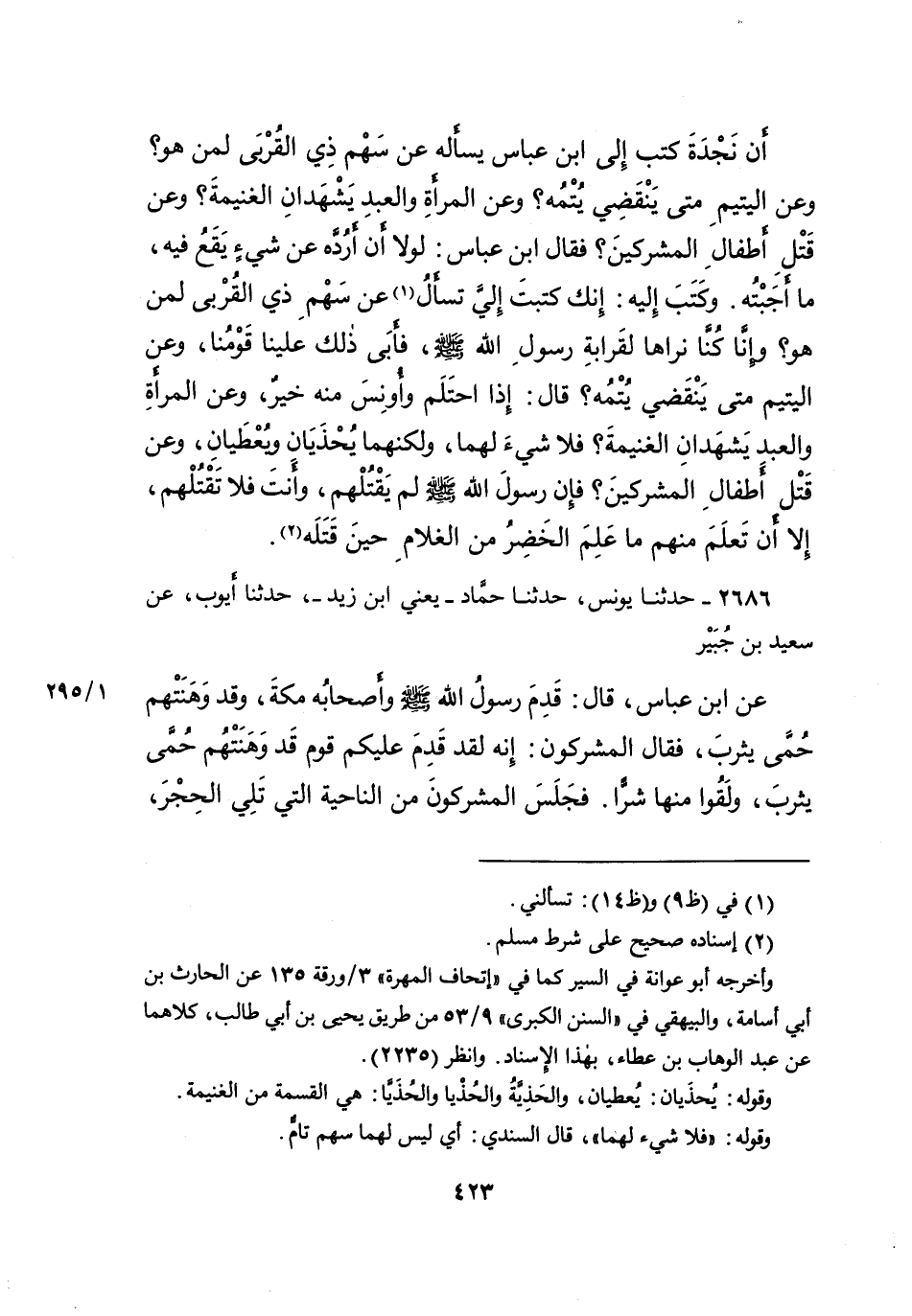 أَنَّ نَجْدَةَ كَتَبَ إِلَى ابْنِ عَبَّاسٍ يَسْأَلُهُ عَنْ سَهْمِ ذِي الْقُرْبَى لِمَنْ هُوَ؟ وَعَنِ الْيَتِيمِ مَتَى يَنْقَضِي يُتْمُهُ؟ وَعَنِ الْمَرْأَةِ وَالْعَبْدِ يَشْهَدَانِ الْغَنِيمَةَ؟ وَعَنْ قَتْلِ أَطْفَالِ الْمُشْرِكِينَ؟ فَقَالَ ابْنُ عَبَّاسٍ: لَوْلا أَنْ أَرُدَّهُ عَنْ شَيْءٍ يَقَعُ فِيهِ، مَا أَجَبْتُهُ. وَكَتَبَ إِلَيْهِ: إِنَّكَ كَتَبْتَ إِلَيَّ تَسْأَلُ (١) عَنْ سَهْمِ ذِي الْقُرْبَى لِمَنْ هُوَ؟ وَإِنَّا كُنَّا نَرَاهَا لِقَرَابَةِ رَسُولِ اللهِ صَلَّى اللهُ عَلَيْهِ وَسَلَّمَ، فَأَبَى ذَلِكَ عَلَيْنَا قَوْمُنَا، وَعَنِ الْيَتِيمِ مَتَى يَنْقَضِي يُتْمُهُ؟ قَالَ: إِذَا احْتَلَمَ وَأُونِسَ مِنْهُ خَيْرٌ، وَعَنِ الْمَرْأَةِ وَالْعَبْدِ يَشْهَدَانِ الْغَنِيمَةَ؟ فَلا شَيْءَ لَهُمَا، وَلَكِنَّهُمَا يُحْذَيَانِ وَيُعْطَيَانِ، وَعَنْ قَتْلِ أَطْفَالِ الْمُشْرِكِينَ؟ " فَإِنَّ رَسُولَ اللهِ صَلَّى اللهُ عَلَيْهِ وَسَلَّمَ لَمْ يَقْتُلْهُمْ "، وَأَنْتَ فَلا تَقْتُلْهُمْ، إِلا أَنْ تَعْلَمَ مِنْهُمْ مَا عَلِمَ الْخَضِرُ مِنَ الغُلامِ حِينَ قَتَلَهُ (٢)