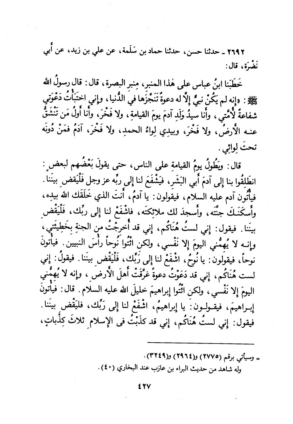 ٢٦٩٢ - حَدَّثَنَا حَسَنٌ، حَدَّثَنَا حَمَّادُ بْنُ سَلَمَةَ، عَنْ عَلِيِّ بْنِ زَيْدٍ، عَنْ أَبِي نَضْرَةَ، قَالَ: خَطَبَنَا ابْنُ عَبَّاسٍ، عَلَى هَذَا الْمِنْبَرِ، مِنْبَرِ الْبَصْرَةِ، قَالَ: قَالَ رَسُولُ اللهِ صَلَّى اللهُ عَلَيْهِ وَسَلَّمَ: " إِنَّهُ لَمْ يَكُنْ نَبِيٌّ إِلا لَهُ دَعْوَةٌ تَنَجَّزَهَا فِي الدُّنْيَا، وَإِنِّي اخْتَبَأْتُ دَعْوَتِي شَفَاعَةً لِأُمَّتِي، وَأَنَا سَيِّدُ وَلَدِ آدَمَ يَوْمَ الْقِيَامَةِ، وَلا فَخْرَ، وَأَنَا أَوَّلُ مَنْ تَنْشَقُ عَنْهُ الْأَرْضُ، وَلا فَخْرَ، وَبِيَدِي لِوَاءُ الْحَمْدِ، وَلا فَخْرَ، آدَمُ فَمَنْ دُونَهُ تَحْتَ لِوَائِي " قَالَ: " وَيَطُولُ يَوْمُ الْقِيَامَةِ عَلَى النَّاسِ، حَتَّى يَقُولَ بَعْضُهُمْ لِبَعْضٍ: انْطَلِقُوا بِنَا إِلَى آدَمَ أَبِي الْبَشَرِ، فَيَشْفَعَ لَنَا إِلَى رَبِّهِ عَزَّ وَجَلَّ فَلْيَقْضِ بَيْنَنَا. فَيَأْتُونَ آدَمَ عَلَيْهِ السَّلامُ، فَيَقُولُونَ: يَا آدَمُ، أَنْتَ الَّذِي خَلَقَكَ اللهُ بِيَدِهِ، وَأَسْكَنَكَ جَنَّتَهُ، وَأَسْجَدَ لَكَ مَلائِكَتَهُ، فَاشْفَعْ لَنَا إِلَى رَبِّكَ، فَلْيَقْضِ بَيْنَنَا. فَيَقُولُ: إِنِّي لَسْتُ هُنَاكُمْ، إِنِّي قَدِ أُخْرِجْتُ مِنَ الجَنَّةِ بِخَطِيئَتِي، وَإِنَّهُ لَا يُهِمُّنِي الْيَوْمَ إِلا نَفْسِي، وَلَكِنِ ائْتُوا نُوحًا رَأْسَ النَّبِيِّينَ. فَيَأْتُونَ نُوحًا، فَيَقُولُونَ: يَا نُوحُ، اشْفَعْ لَنَا إِلَى رَبِّكَ، فَلْيَقْضِ بَيْنَنَا. فَيَقُولُ: إِنِّي لَسْتُ هُنَاكُمْ، إِنِّي قَدْ دَعَوْتُ دَعْوَةً غَرَّقَتْ أَهْلَ الْأَرْضِ، وَإِنَّهُ لَا يُهِمُّنِي الْيَوْمَ إِلا نَفْسِي، وَلَكِنِ ائْتُوا إِبْرَاهِيمَ خَلِيلَ اللهِ عَلَيْهِ السَّلامُ. قَالَ: فَيَأْتُونَ إِبْرَاهِيمَ، فَيَقُولُونَ: يَا إِبْرَاهِيمُ، اشْفَعْ لَنَا إِلَى رَبِّكَ، فَلْيَقْضِ بَيْنَنَا. فَيَقُولُ: إِنِّي لَسْتُ هُنَاكُمْ، إِنِّي قَدْ كَذَبْتُ فِي الْإِسْلامِ ثَلاثَ كِذْبَاتٍ،