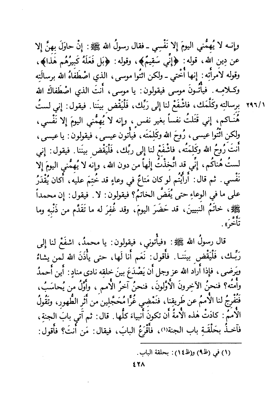 وَإِنَّهُ لَا يُهِمُّنِي الْيَوْمَ إِلا نَفْسِي - فَقَالَ رَسُولُ اللهِ صَلَّى اللهُ عَلَيْهِ وَسَلَّمَ: إِنْ حَاوَلَ بِهِنَّ إِلا عَنْ دِينِ اللهِ، قَوْلُهُ: {إِنِّي سَقِيمٌ} [الصافات: ٨٩] ، وَقَوْلُهُ: {بَلْ فَعَلَهُ كَبِيرُهُمْ هَذَا} [الأنبياء: ٦٣] ، وَقَوْلُهُ لِامْرَأَتِهِ: إِنَّهَا أُخْتِي - وَلَكِنِ ائْتُوا مُوسَى عَلَيْهِ السَّلامُ، الَّذِي اصْطَفَاهُ اللهُ بِرِسَالَتِهِ وَكَلامِهِ. فَيَأْتُونَ مُوسَى، فَيَقُولُونَ: يَا مُوسَى، أَنْتَ الَّذِي اصْطَفَاكَ اللهُ بِرِسَالَتِهِ وَكَلَّمَكَ، فَاشْفَعْ لَنَا إِلَى رَبِّكَ، فَلْيَقْضِ بَيْنَنَا. فَيَقُولُ: إِنِّي لَسْتُ هُنَاكُمْ، إِنِّي قَتَلْتُ نَفْسًا بِغَيْرِ نَفْسٍ، وَإِنَّهُ لَا يُهِمُّنِي الْيَوْمَ إِلا نَفْسِي، وَلَكِنِ ائْتُوا عِيسَى، رُوحَ اللهِ وَكَلِمَتَهُ، فَيَأْتُونَ عِيسَى، فَيَقُولُونَ: يَا عِيسَى، أَنْتَ رُوحُ اللهِ وَكَلِمَتُهُ، فَاشْفَعْ لَنَا إِلَى رَبِّكَ، فَلْيَقْضِ بَيْنَنَا. فَيَقُولُ: إِنِّي لَسْتُ هُنَاكُمْ، قَدِ اتُّخِذْتُ إِلَهًا مِنْ دُونِ اللهِ، وَإِنَّهُ لَا يُهِمُّنِي الْيَوْمَ إِلا نَفْسِي. ثُمَّ قَالَ: أَرَأَيْتُمْ لَوْ كَانَ مَتَاعٌ فِي وِعَاءٍ قَدْ خُتِمَ عَلَيْهِ، أَكَانَ يُقْدَرُ عَلَى مَا فِي الْوِعَاءِ حَتَّى يُفَضَّ الْخَاتَمُ؟ فَيَقُولُونَ: لَا ٠ فَيَقُولُ: إِنَّ مُحَمَّدًا صَلَّى اللهُ عَلَيْهِ وَسَلَّمَ، خَاتَمَ النَّبِيِّينَ، قَدْ حَضَرَ الْيَوْمَ، وَقَدْ غُفِرَ لَهُ مَا تَقَدَّمَ مِنْ ذَنْبِهِ وَمَا تَأَخَّرَ ". قَالَ رَسُولُ اللهِ صَلَّى اللهُ عَلَيْهِ وَسَلَّمَ: " فَيَأْتُونِي، فَيَقُولُونَ: يَا مُحَمَّدُ، اشْفَعْ لَنَا إِلَى رَبِّكَ، فَلْيَقْضِ بَيْنَنَا. فَأَقُولُ: نَعَمْ أَنَا لَهَا، حَتَّى يَأْذَنَ اللهُ لِمَنْ يَشَاءُ وَيَرْضَى، فَإِذَا أَرَادَ اللهُ عَزَّ وَجَلَّ أَنْ يَصْدَعَ بَيْنَ خَلْقِهِ نَادَى مُنَادٍ: أَيْنَ أَحْمَدُ وَأُمَّتُهُ؟ فَنَحْنُ الْآخِرُونَ الْأَوَّلُونَ، فَنَحْنُ آخِرُ الْأُمَمِ، وَأَوَّلُ مَنْ يُحَاسَبُ، فَتُفْرَجُ لَنَا الْأُمَمُ عَنْ طَرِيقِنَا، فَنَمْضِي غُرًّا مُحَجَّلِينَ مِنْ أَثَرِ الطُّهُورِ، وَتَقُولُ الْأُمَمُ: كَادَتْ هَذِهِ الْأُمَّةُ أَنْ تَكُونَ أَنْبِيَاءَ كُلُّهَا ". قَالَ: " ثُمَّ آتِي بَابَ الْجَنَّةِ، فَآخُذُ بِحَلْقَةِ بَابِ الْجَنَّةِ، (١) فَأَقْرَعُ الْبَابَ، فَيُقَالُ: مَنْ أَنْتَ؟ فَأَقُولُ: