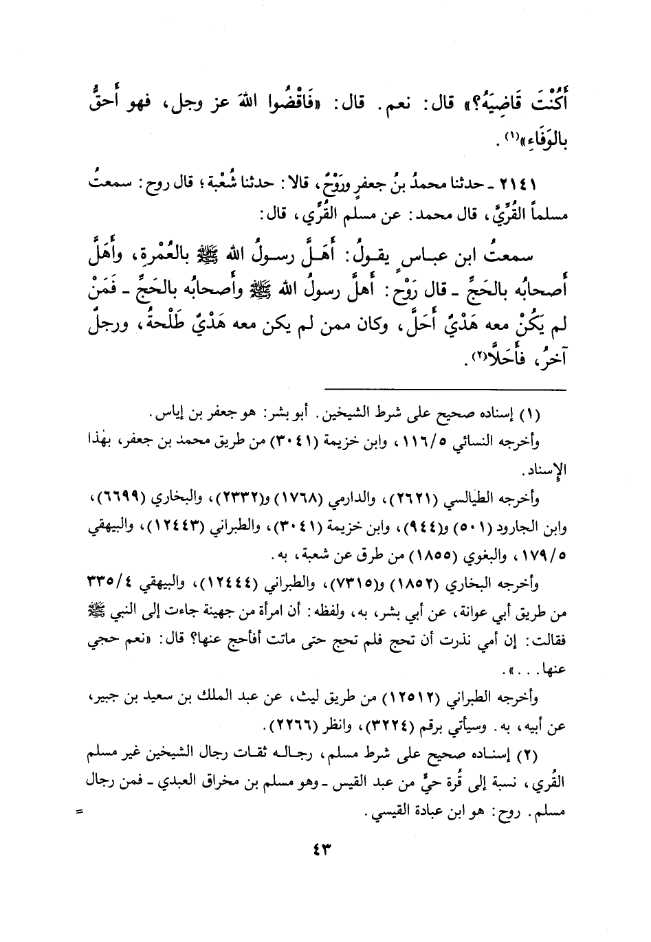 ٢١٤١ - حَدَّثَنَا مُحَمَّدُ بْنُ جَعْفَرٍ، وَرَوْحٌ، قَالا: حَدَّثَنَا شُعْبَةُ، قَالَ رَوْحٌ: سَمِعْتُ مُسْلِمًا الْقُرِّيَّ، قَالَ مُحَمَّدٌ: عَنْ مُسْلِمٍ الْقُرِّيِّ، قَالَ: سَمِعْتُ ابْنَ عَبَّاسٍ، يَقُولُ: " أَهَلَّ رَسُولُ اللهِ صَلَّى اللهُ عَلَيْهِ وَسَلَّمَ، بِالْعُمْرَةِ، وَأَهَلَّ أَصْحَابُهُ بِالْحَجِّ " - قَالَ رَوْحٌ: أَهَلَّ رَسُولُ اللهِ صَلَّى اللهُ عَلَيْهِ وَسَلَّمَ وَأَصْحَابُهُ بِالْحَجِّ - فَمَنْ لَمْ يَكُنْ مَعَهُ هَدْيٌ أَحَلَّ، وَكَانَ مِمَّنْ لَمْ يَكُنْ مَعَهُ هَدْيٌ طَلْحَةُ، وَرَجُلٌ آخَرُ فَأَحَلا (٢)