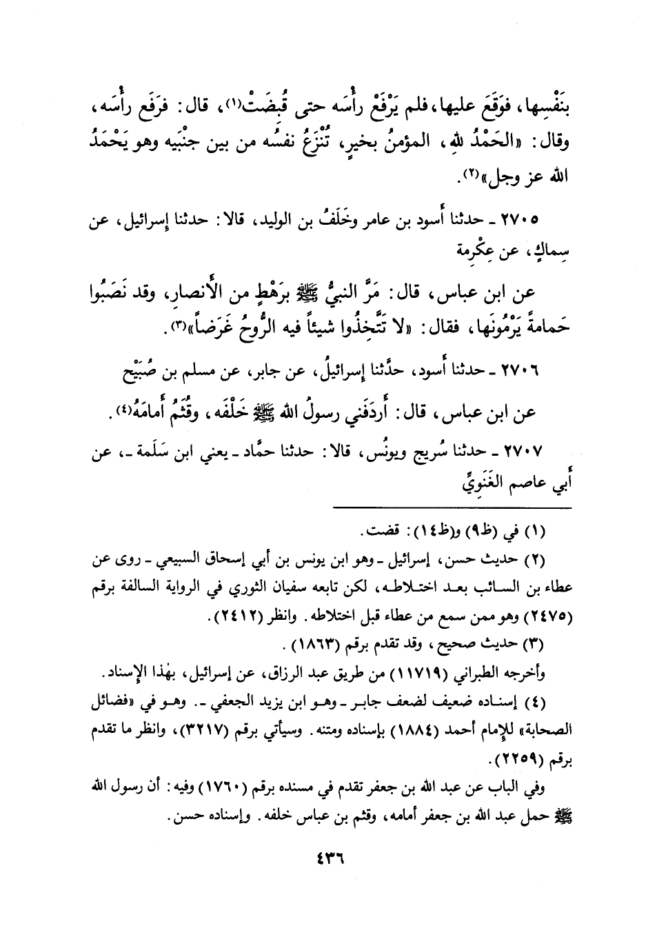 ٢٧٠٥ - حَدَّثَنَا أَسْوَدُ بْنُ عَامِرٍ، وَخَلَفُ بْنُ الْوَلِيدِ، قَالا: حَدَّثَنَا إِسْرَائِيلُ، عَنْ سِمَاكٍ، عَنْ عِكْرِمَةَ، عَنِ ابْنِ عَبَّاسٍ، قَالَ: مَرَّ النَّبِيُّ صَلَّى اللهُ عَلَيْهِ وَسَلَّمَ بِرَهْطٍ مِنَ الْأَنْصَارِ، وَقَدْ نَصَبُوا حَمَامَةً يَرْمُونَهَا، فَقَالَ: " لَا تَتَّخِذُوا شَيْئًا فِيهِ الرُّوحُ غَرَضًا " (٣)