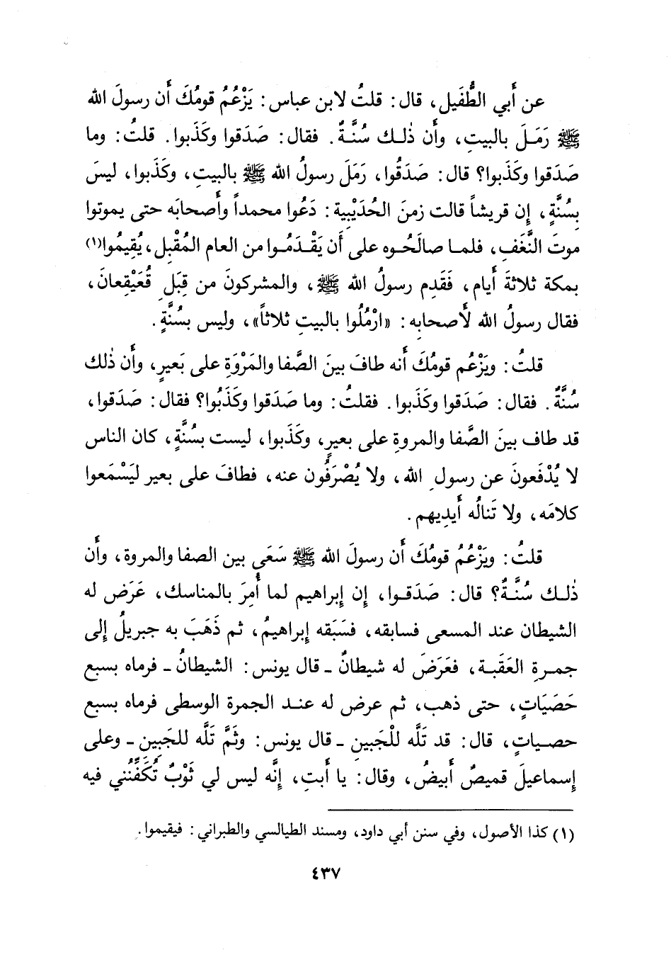 عَنْ أَبِي الطُّفَيْلِ، قَالَ: قُلْتُ لِابْنِ عَبَّاسٍ: يَزْعُمُ قَوْمُكَ أَنَّ رَسُولَ اللهِ صَلَّى اللهُ عَلَيْهِ وَسَلَّمَ، رَمَلَ بِالْبَيْتِ، وَأَنَّ ذَلِكَ سُنَّةٌ. فَقَالَ: صَدَقُوا وَكَذَبُوا. قُلْتُ: وَمَا صَدَقُوا وَكَذَبُوا؟ قَالَ: صَدَقُوا، رَمَلَ رَسُولُ اللهِ صَلَّى اللهُ عَلَيْهِ وَسَلَّمَ بِالْبَيْتِ، وَكَذَبُوا، لَيْسَ بِسُنَّةٍ، إِنَّ قُرَيْشًا قَالَتْ: زَمَنَ الْحُدَيْبِيَةِ: دَعُوا مُحَمَّدًا وَأَصْحَابَهُ حَتَّى يَمُوتُوا مَوْتَ النَّغَفِ، فَلَمَّا صَالَحُوهُ عَلَى أَنْ يَقْدَمُوا مِنَ العَامِ الْمُقْبِلِ، يُقِيمُوا (١) بِمَكَّةَ ثَلاثَةَ أَيَّامٍ، فَقَدِمَ رَسُولُ اللهِ صَلَّى اللهُ عَلَيْهِ وَسَلَّمَ، وَالْمُشْرِكُونَ مِنْ قِبَلِ قُعَيْقِعَانَ، فَقَالَ رَسُولُ اللهِ صَلَّى اللهُ عَلَيْهِ وَسَلَّمَ لِأَصْحَابِهِ: " ارْمُلُوا بِالْبَيْتِ ثَلاثًا "، وَلَيْسَ بِسُنَّةٍ. قُلْتُ: وَيَزْعُمُ قَوْمُكَ أَنَّهُ طَافَ بَيْنَ الصَّفَا وَالْمَرْوَةِ عَلَى بَعِيرٍ، وَأَنَّ ذَلِكَ سُنَّةٌ. فَقَالَ: صَدَقُوا وَكَذَبُوا. فَقُلْتُ: وَمَا صَدَقُوا وَكَذَبُوا؟ فَقَالَ: صَدَقُوا، قَدْ طَافَ بَيْنَ الصَّفَا وَالْمَرْوَةِ عَلَى بَعِيرٍ، وَكَذَبُوا، لَيْسَ بِسُنَّةٍ، كَانَ النَّاسُ لَا يُدْفَعُونَ عَنْ رَسُولِ اللهِ، وَلا يُصْرَفُونَ عَنْهُ، فَطَافَ عَلَى بَعِيرٍ لِيَسْمَعُوا كَلامَهُ، وَلا تَنَالُهُ أَيْدِيهِمْ، قُلْتُ: وَيَزْعُمُ قَوْمُكَ أَنَّ رَسُولَ اللهِ صَلَّى اللهُ عَلَيْهِ وَسَلَّمَ سَعَى بَيْنَ الصَّفَا وَالْمَرْوَةِ، وَأَنَّ ذَلِكَ سُنَّةٌ؟ قَالَ: صَدَقُوا، إِنَّ إِبْرَاهِيمَ لَمَّا أُمِرَ بِالْمَنَاسِكِ، عَرَضَ لَهُ الشَّيْطَانُ عِنْدَ الْمَسْعَى فَسَابَقَهُ، فَسَبَقَهُ إِبْرَاهِيمُ، ثُمَّ ذَهَبَ بِهِ جِبْرِيلُ إِلَى جَمْرَةِ الْعَقَبَةِ، فَعَرَضَ لَهُ شَيْطَانٌ - قَالَ يُونُسُ: الشَّيْطَانُ - فَرَمَاهُ بِسَبْعِ حَصَيَاتٍ، حَتَّى ذَهَبَ، ثُمَّ عَرَضَ لَهُ عِنْدَ الْجَمْرَةِ الْوُسْطَى فَرَمَاهُ بِسَبْعِ حَصَيَاتٍ، قَالَ: قَدْ تَلَّهُ لِلجَبِينِ - قَالَ يُونُسُ: وَثَمَّ تَلَّهُ لِلجَبِينِ - وَعَلَى إِسْمَاعِيلَ قَمِيصٌ أَبْيَضُ، وَقَالَ: يَا أَبَتِ، إِنَّهُ لَيْسَ لِي ثَوْبٌ تُكَفِّنُنِي فِيهِ