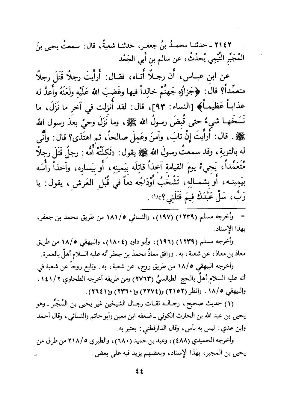 ٢١٤٢ - حَدَّثَنَا مُحَمَّدُ بْنُ جَعْفَرٍ، حَدَّثَنَا شُعْبَةُ، قَالَ: سَمِعْتُ يَحْيَى بْنَ الْمُجَبِّرِ التَّيْمِيَّ، يُحَدِّثُ عَنْ سَالِمِ بْنِ أَبِي الْجَعْدِ، عَنِ ابْنِ عَبَّاسٍ، أَنَّ رَجُلًا أَتَاهُ، فَقَالَ: أَرَأَيْتَ رَجُلًا قَتَلَ رَجُلًا مُتَعَمِّدًا؟ قَالَ: {جَزَاؤُهُ جَهَنَّمُ خَالِدًا فِيهَا وَغَضِبَ اللهُ عَلَيْهِ وَلَعَنَهُ وَأَعَدَّ لَهُ عَذَابًا عَظِيمًا} ، قَالَ: لَقَدْ أُنْزِلَتْ فِي آخِرِ مَا نَزَلَ، مَا نَسَخَهَا شَيْءٌ حَتَّى قُبِضَ رَسُولُ اللهِ صَلَّى اللهُ عَلَيْهِ وَسَلَّمَ، وَمَا نَزَلَ وَحْيٌ بَعْدَ رَسُولِ اللهِ صَلَّى اللهُ عَلَيْهِ وَسَلَّمَ، قَالَ: أَرَأَيْتَ إِنْ تَابَ وَآمَنَ وَعَمِلَ صَالِحًا، ثُمَّ اهْتَدَى؟ قَالَ: وَأَنَّى لَهُ بِالتَّوْبَةِ، وَقَدْ سَمِعْتُ رَسُولَ اللهِ صَلَّى اللهُ عَلَيْهِ وَسَلَّمَ يَقُولُ: " ثَكِلَتْهُ أُمُّهُ: رَجُلٌ قَتَلَ رَجُلًا مُتَعَمِّدًا، يَجِيءُ يَوْمَ الْقِيَامَةِ آخِذًا قَاتِلَهُ بِيَمِينِهِ، أَوْ بِيَسَارِهِ، وَآخِذًا رَأْسَهُ بِيَمِينِهِ، أَوْ بِشِمَالِهِ، تَشْخَبُ أَوْدَاجُهُ دَمًا فِي قُبُلِ الْعَرْشِ، يَقُولُ: يَا رَبِّ سَلْ عَبْدَكَ فِيمَ قَتَلَنِي؟ " (١)