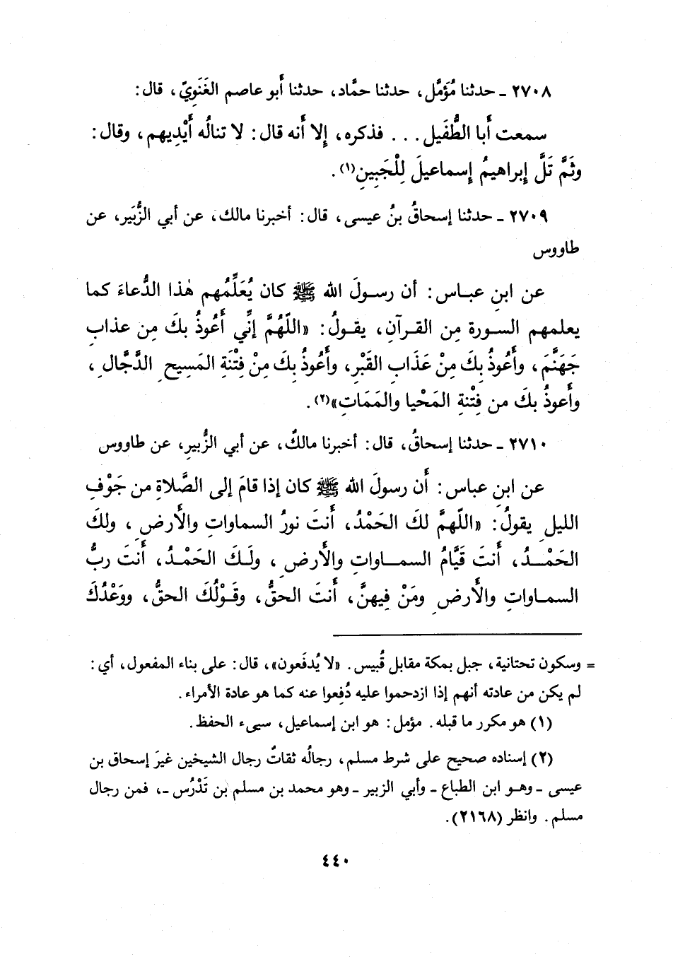 ٢٧٠٩ - حَدَّثَنَا إِسْحَاقُ بْنُ عِيسَى، قَالَ: أَخْبَرَنَا مَالِكٌ، عَنْ أَبِي الزُّبَيْرِ، عَنْ طَاوُسٍ، عَنِ ابْنِ عَبَّاسٍ، أَنَّ رَسُولَ اللهِ صَلَّى اللهُ عَلَيْهِ وَسَلَّمَ كَانَ يُعَلِّمُهُمْ هَذَا الدُّعَاءَ كَمَا يُعَلِّمُهُمِ السُّورَةَ مِنَ القُرْآنِ يَقُولَ: " اللهُمَّ إِنِّي أَعُوذُ بِكَ مِنْ عَذَابِ جَهَنَّمَ، وَأَعُوذُ بِكَ مِنْ عَذَابِ الْقَبْرِ، وَأَعُوذُ بِكَ مِنْ فِتْنَةِ الْمَسِيحِ الدَّجَّالِ، وَأَعُوذُ بِكَ مِنْ فِتْنَةِ الْمَحْيَا وَالْمَمَاتِ " (٢)