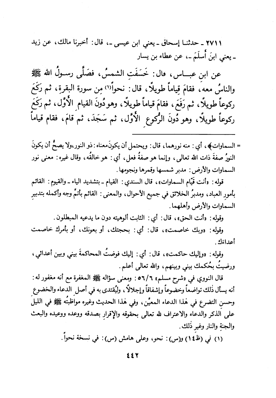 ٢٧١١ - حَدَّثَنَا إِسْحَاقُ يَعْنِي ابْنَ عِيسَى، قَالَ: أَخْبَرَنَا مَالِكٌ، عَنْ زَيْدٍ يَعْنِي ابْنَ أَسْلَمَ، عَنْ عَطَاءِ بْنِ يَسَارٍ، عَنِ ابْنِ عَبَّاسٍ، قَالَ: خَسَفَتِ الشَّمْسُ، فَصَلَّى رَسُولُ اللهِ صَلَّى اللهُ عَلَيْهِ وَسَلَّمَ وَالنَّاسُ مَعَهُ، فَقَامَ قِيَامًا طَوِيلًا، قَالَ: نَحْوًا (١) مِنْ سُورَةِ الْبَقَرَةِ، ثُمَّ رَكَعَ رُكُوعًا طَوِيلًا، ثُمَّ رَفَعَ فَقَامَ قِيَامًا طَوِيلًا، وَهُوَ دُونَ الْقِيَامِ الْأَوَّلِ، ثُمَّ رَكَعَ رُكُوعًا طَوِيلًا، وَهُوَ دُونَ الرُّكُوعِ الْأَوَّلِ، ثُمَّ سَجَدَ، ثُمَّ قَامَ، فَقَامَ قِيَامًا