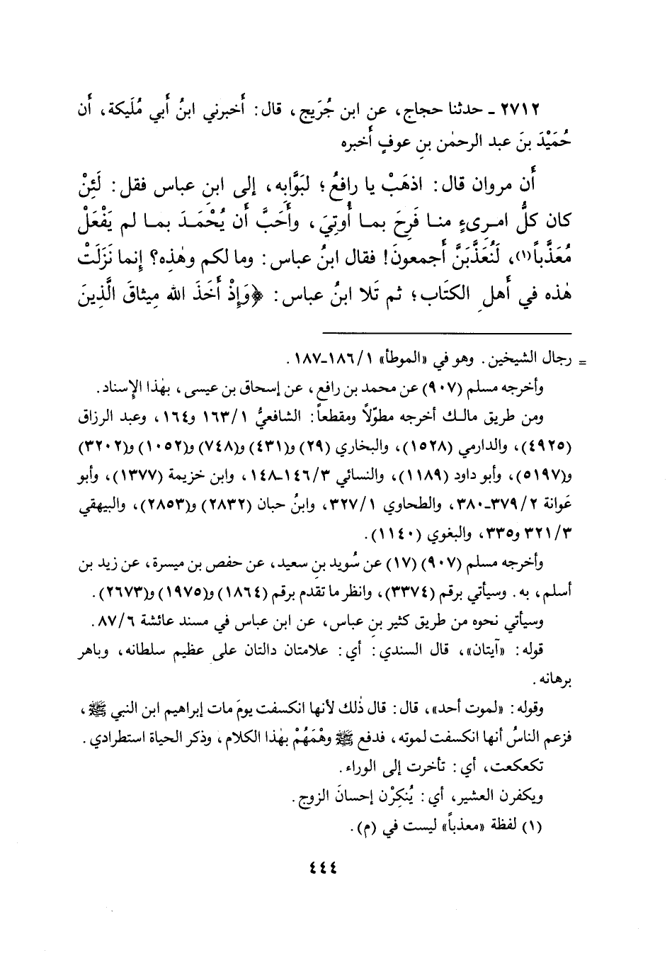 ٢٧١٢ - حَدَّثَنَا حَجَّاجٌ، عَنِ ابْنِ جُرَيْجٍ، قَالَ: أَخْبَرَنِي ابْنُ أَبِي مُلَيْكَةَ، أَنَّ حُمَيْدَ بْنَ عَبْدِ الرَّحْمَنِ بْنِ عَوْفٍ، أَخْبَرَهُ، أَنَّ مَرْوَانَ قَالَ: اذْهَبْ يَا رَافِعُ، لِبَوَّابِهِ، إِلَى ابْنِ عَبَّاسٍ فَقُلْ: لَئِنْ كَانَ كُلُّ امْرِئٍ مِنَّا فَرِحَ بِمَا أُوتِيَ، وَأَحَبَّ أَنْ يُحْمَدَ بِمَا لَمْ يَفْعَلْ مُعَذَّبًا، (١) لَنُعَذَّبَنَّ أَجْمَعُونَ فَقَالَ ابْنُ عَبَّاسٍ: وَمَا لَكُمْ وَهَذِهِ؟ إِنَّمَا نَزَلَتْ هَذِهِ فِي أَهْلِ الْكِتَابِ، ثُمَّ تَلا ابْنُ عَبَّاسٍ: {وَإِذْ أَخَذَ اللهُ مِيثَاقَ الَّذِينَ
