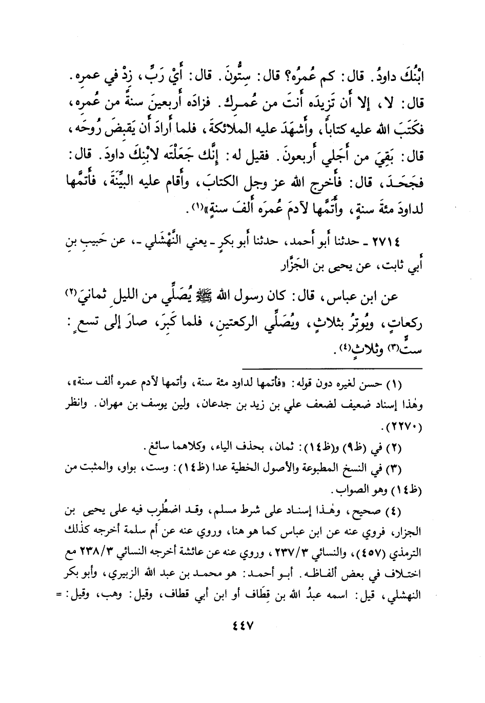 ٢٧١٤ - حَدَّثَنَا أَبُو أَحْمَدَ، حَدَّثَنَا أَبُو بَكْرٍ يَعْنِي النَّهْشَلِيَّ، عَنْ حَبِيبِ بْنِ أَبِي ثَابِتٍ، عَنْ يَحْيَى بْنِ الْجَزَّارِ، عَنِ ابْنِ عَبَّاسٍ، قَالَ: " كَانَ رَسُولُ اللهِ صَلَّى اللهُ عَلَيْهِ وَسَلَّمَ يُصَلِّي مِنَ اللَّيْلِ ثَمَانِيَ (٢) رَكَعَاتٍ، وَيُوتِرُ بِثَلاثٍ، وَيُصَلِّي الرَّكْعَتَيْنِ، فَلَمَّا كَبِرَ، صَارَ إِلَى تِسْعٍ: وَسِتٍّ (٣) وَثَلاثٍ " (٤)