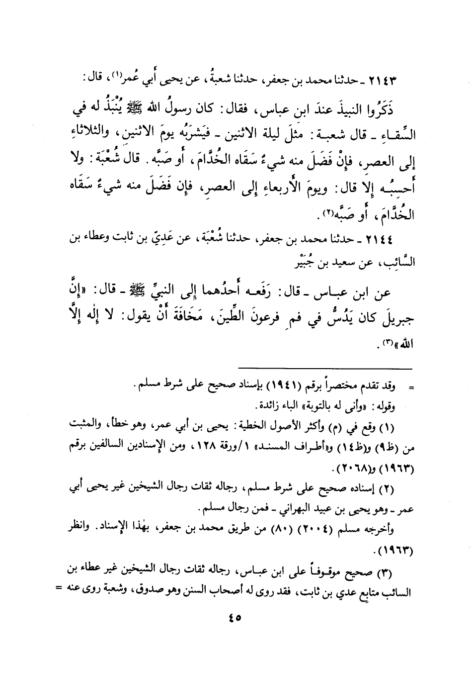 ٢١٤٣ - حَدَّثَنَا مُحَمَّدُ بْنُ جَعْفَرٍ، حَدَّثَنَا شُعْبَةُ، عَنْ يَحْيَى أَبِي عُمَرَ، (١) قَالَ: ذَكَرُوا النَّبِيذَ عِنْدَ ابْنِ عَبَّاسٍ، فَقَالَ: " كَانَ رَسُولُ اللهِ صَلَّى اللهُ عَلَيْهِ وَسَلَّمَ، يُنْبَذُ لَهُ فِي السِّقَاءِ - قَالَ شُعْبَةُ: مِثْلَ لَيْلَةِ الاثْنَيْنِ - فَيَشْرَبُهُ يَوْمَ الاثْنَيْنِ، وَالثُّلاثَاءِ إِلَى الْعَصْرِ، فَإِنْ فَضَلَ مِنْهُ شَيْءٌ سَقَاهُ الْخُدَّامَ، أَوْ صَبَّهُ " قَالَ شُعْبَةُ: وَلا أَحْسِبُهُ إِلا قَالَ: " وَيَوْمَ الْأَرْبِعَاءِ إِلَى الْعَصْرِ، فَإِنْ فَضَلَ مِنْهُ شَيْءٌ سَقَاهُ الْخُدَّامَ أَوْ صَبَّهُ " (٢)
