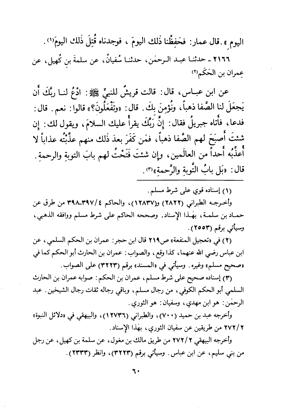 ٢١٦٦ - حَدَّثَنَا عَبْدُ الرَّحْمَنِ، حَدَّثَنَا سُفْيَانُ، عَنْ سَلَمَةَ بْنِ كُهَيْلٍ، عَنْ عِمْرَانَ أَبِي الْحَكَمِ، (٢) عَنِ ابْنِ عَبَّاسٍ، قَالَ: قَالَتْ قُرَيْشٌ لِلنَّبِيِّ صَلَّى اللهُ عَلَيْهِ وَسَلَّمَ: ادْعُ لَنَا رَبَّكَ أَنْ يَجْعَلَ لَنَا الصَّفَا ذَهَبًا، وَنُؤْمِنُ بِكَ، قَالَ: " وَتَفْعَلُونَ؟ " قَالُوا: نَعَمْ، قَالَ: فَدَعَا، فَأَتَاهُ جِبْرِيلُ فَقَالَ: " إِنَّ رَبَّكَ يَقْرَأُ عَلَيْكَ السَّلامَ، وَيَقُولُ: إِنْ شِئْتَ أَصْبَحَ لَهُمُ الصَّفَا ذَهَبًا، فَمَنْ كَفَرَ بَعْدَ ذَلِكَ مِنْهُمْ عَذَّبْتُهُ عَذَابًا لَا أُعَذِّبُهُ أَحَدًا مِنَ العَالَمِينَ، وَإِنْ شِئْتَ فَتَحْتُ لَهُمْ بَابَ التَّوْبَةِ وَالرَّحْمَةِ "، قَالَ: " بَلْ بَابُ التَّوْبَةِ وَالرَّحْمَةِ " (٣)