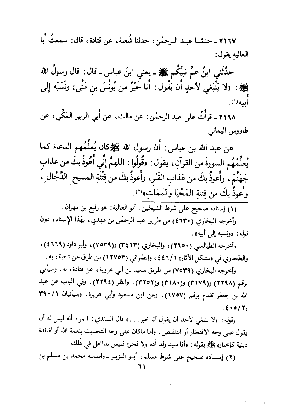 ٢١٦٧ - حَدَّثَنَا عَبْدُ الرَّحْمَنِ، حَدَّثَنَا شُعْبَةُ، عَنْ قَتَادَةَ، قَالَ: سَمِعْتُ أَبَا الْعَالِيَةِ، يَقُولُ: حَدَّثَنِي ابْنُ عَمِّ، نَبِيِّكُمْ صَلَّى اللهُ عَلَيْهِ وَسَلَّمَ يَعْنِي ابْنَ عَبَّاسٍ، قَالَ: قَالَ رَسُولُ اللهِ صَلَّى اللهُ عَلَيْهِ وَسَلَّمَ: " لَا يَنْبَغِي لِأَحَدٍ أَنْ يَقُولَ: أَنَا خَيْرٌ مِنْ يُونُسَ بْنِ مَتَّى، وَنَسَبَهُ إِلَى أَبِيهِ " (١)