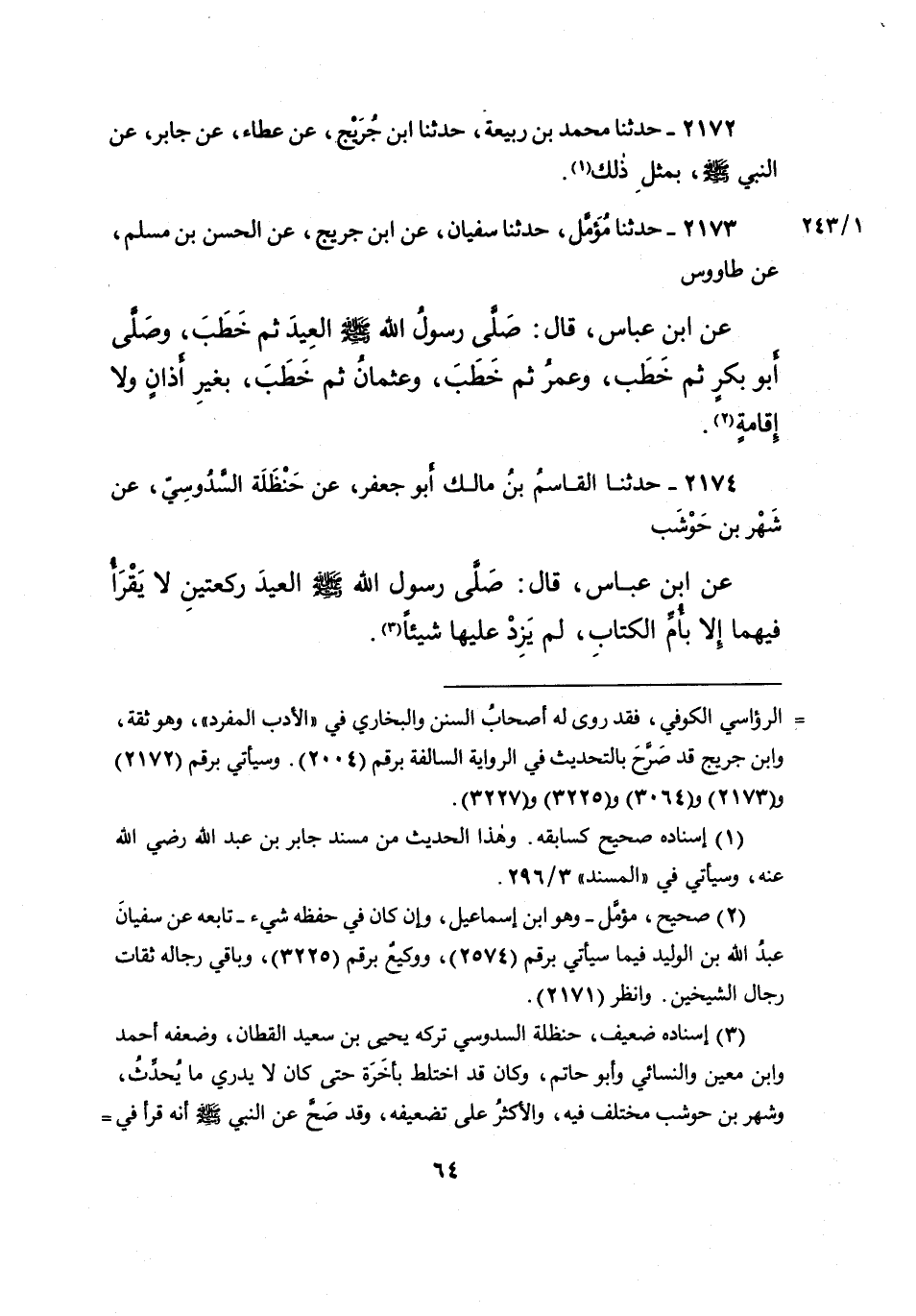 ٢١٧٣ - حَدَّثَنَا مُؤَمَّلٌ، حَدَّثَنَا سُفْيَانُ، عَنِ ابْنِ جُرَيْجٍ، عَنِ الْحَسَنِ بْنِ مُسْلِمٍ، عَنْ طَاوُسٍ، عَنِ ابْنِ عَبَّاسٍ، قَالَ: " صَلَّى رَسُولُ اللهِ صَلَّى اللهُ عَلَيْهِ وَسَلَّمَ الْعِيدَ ثُمَّ خَطَبَ، وَصَلَّى أَبُو بَكْرٍ ثُمَّ خَطَبَ، وَعُمَرُ ثُمَّ خَطَبَ، وَعُثْمَانُ ثُمَّ خَطَبَ بِغَيْرِ أَذَانٍ وَلا إِقَامَةٍ " (٢)