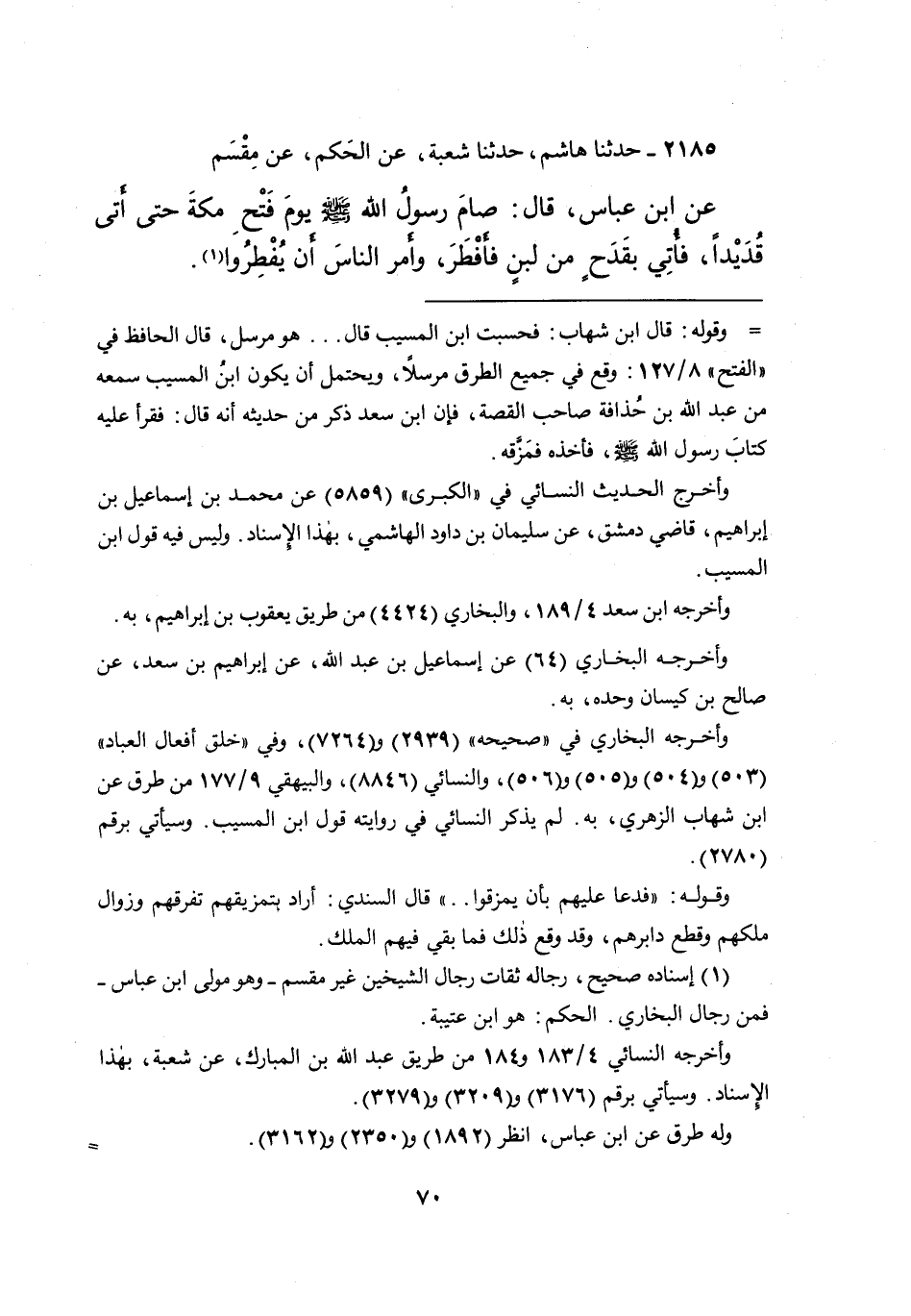 ٢١٨٥ - حَدَّثَنَا هَاشِمٌ، حَدَّثَنَا شُعْبَةُ، عَنِ الْحَكَمِ، عَنْ مِقْسَمٍ، عَنِ ابْنِ عَبَّاسٍ، قَالَ: " صَامَ رَسُولُ اللهِ صَلَّى اللهُ عَلَيْهِ وَسَلَّمَ، يَوْمَ فَتْحِ مَكَّةَ حَتَّى أَتَى قُدَيْدًا، فَأُتِيَ بِقَدَحٍ مِنْ لَبَنٍ فَأَفْطَرَ، وَأَمَرَ النَّاسَ أَنْ يُفْطِرُوا " (١)