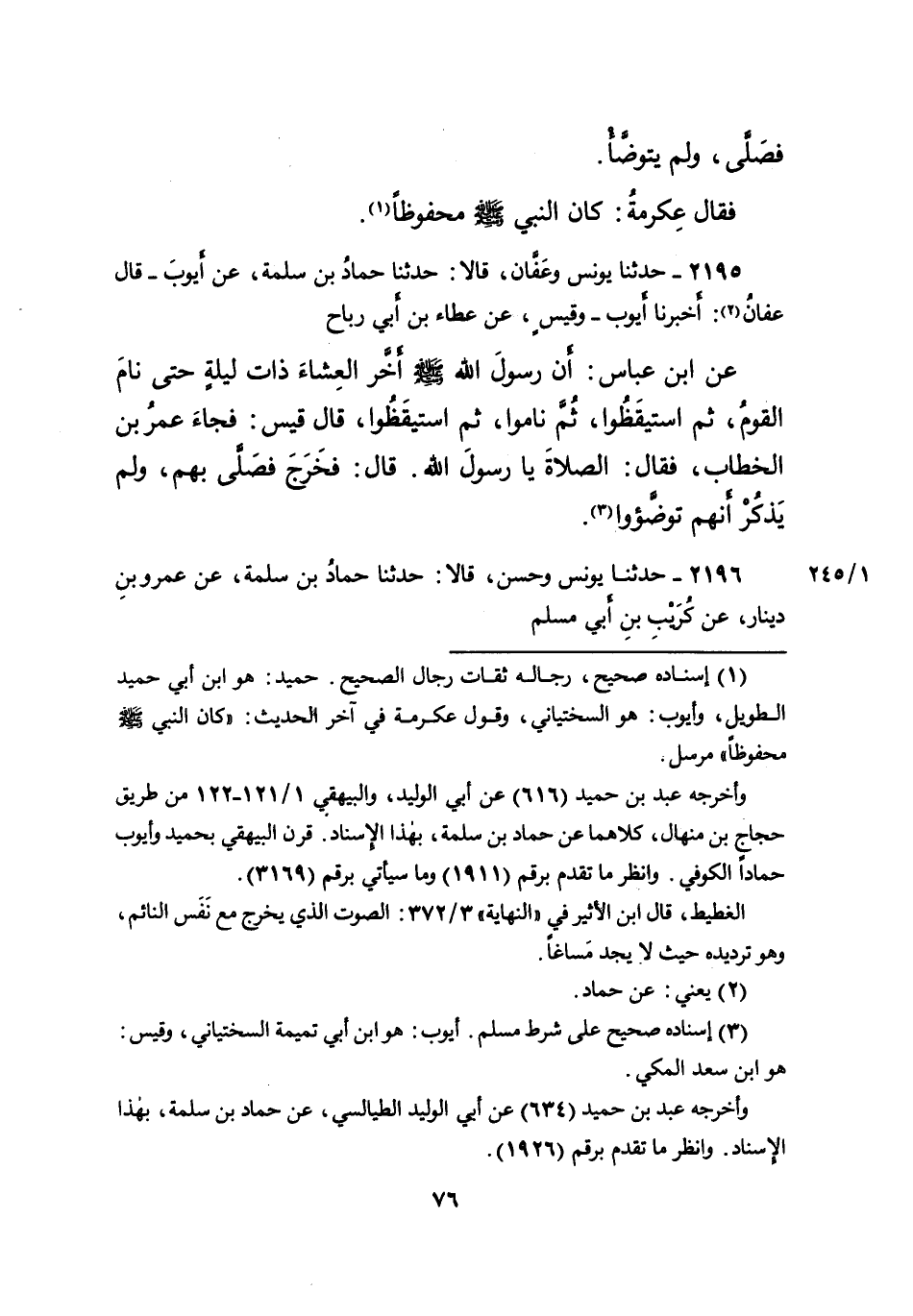 ٢١٩٥ - حَدَّثَنَا يُونُسُ، وَعَفَّانُ، قَالا: حَدَّثَنَا حَمَّادُ بْنُ سَلَمَةَ، عَنْ أَيُّوبَ، قَالَ عَفَّانُ (٢) : أَخْبَرَنَا أَيُّوبُ، وَقَيْسٌ، عَنْ عَطَاءِ بْنِ أَبِي رَبَاحٍ، عَنِ ابْنِ عَبَّاسٍ: " أَنَّ رَسُولَ اللهِ صَلَّى اللهُ عَلَيْهِ وَسَلَّمَ، أَخَّرَ الْعِشَاءَ ذَاتَ لَيْلَةٍ، حَتَّى نَامَ الْقَوْمُ، ثُمَّ اسْتَيْقَظُوا، ثُمَّ نَامُوا، ثُمَّ اسْتَيْقَظُوا " - قَالَ قَيْسٌ: - فَجَاءَ عُمَرُ بْنُ الْخَطَّابِ، فَقَالَ: الصَّلاةَ يَا رَسُولَ اللهِ، قَالَ: " فَخَرَجَ فَصَلَّى بِهِمْ وَلَمْ يَذْكُرْ أَنَّهُمْ تَوَضَّئُوا " (٣)