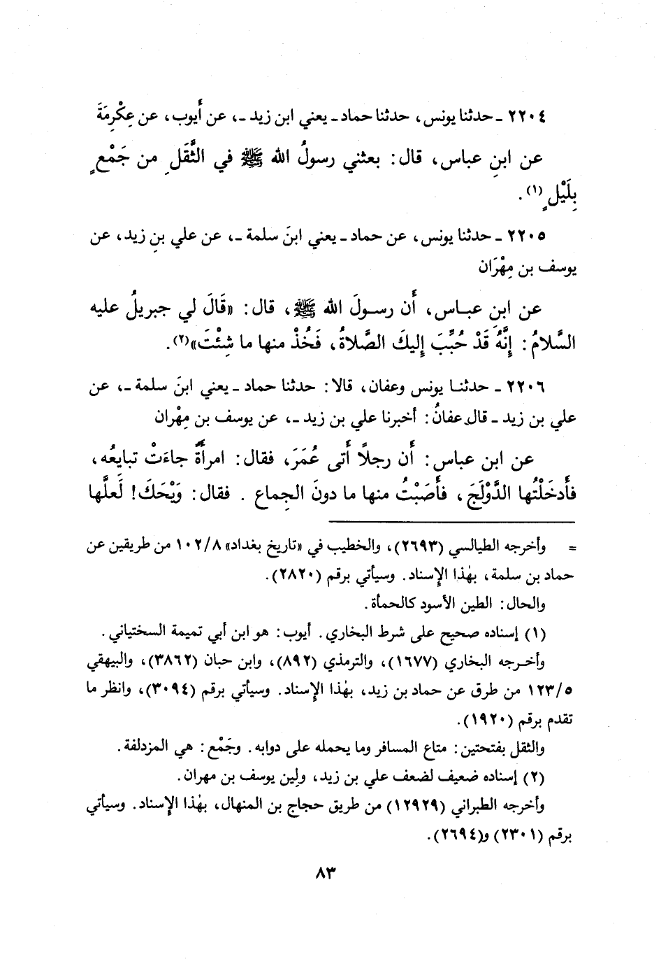 ٢٢٠٤ - حَدَّثَنَا يُونُسُ، حَدَّثَنَا حَمَّادٌ يَعْنِي ابْنَ زَيْدٍ، عَنْ أَيُّوبَ، عَنْ عِكْرِمَةَ، عَنِ ابْنِ عَبَّاسٍ، قَالَ: " بَعَثَنِي رَسُولُ اللهِ صَلَّى اللهُ عَلَيْهِ وَسَلَّمَ، فِي الثَّقَلِ مِنْ جَمْعٍ بِلَيْلٍ " (١)