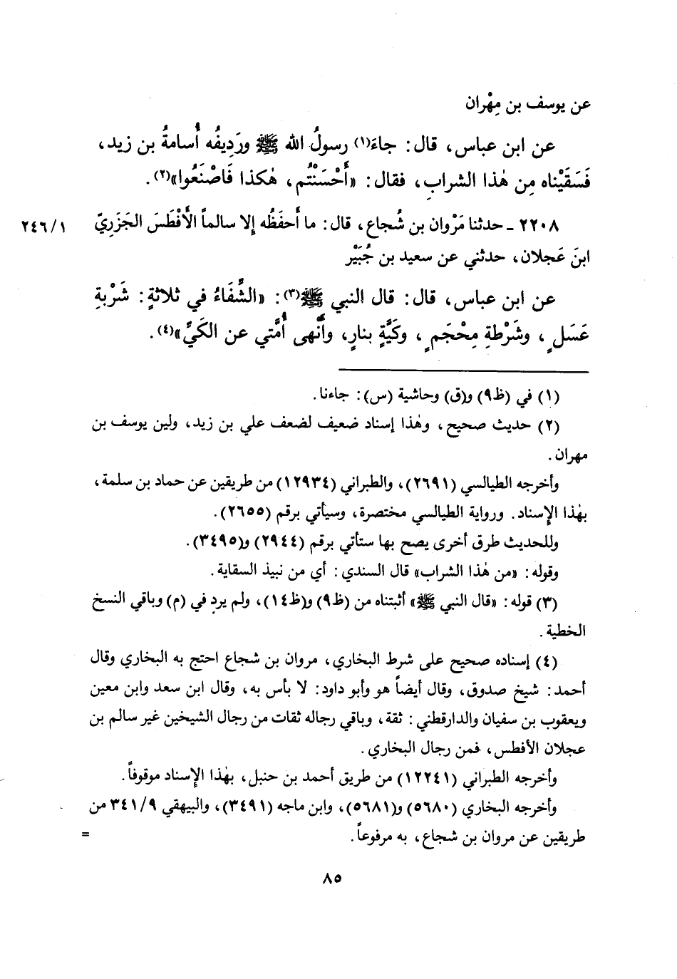 ٢٢٠٨ - حَدَّثَنَا مَرْوَانُ بْنُ شُجَاعٍ، قَالَ: مَا أَحْفَظُهُ إِلَّا سَالِمٌ الْأَفْطَسُ الْجَزَرِيُّ ابْنُ عَجْلانَ، حَدَّثَنِي عَنْ سَعِيدِ بْنِ جُبَيْرٍ، عَنِ ابْنِ عَبَّاسٍ، قَالَ: قَالَ النَّبِيُّ صَلَّى اللهُ عَلَيْهِ وَسَلَّمَ (٣) : " الشِّفَاءُ فِي ثَلاثَةٍ: شَرْبَةِ عَسَلٍ، وَشَرْطَةِ مِحْجَمٍ، وَكَيَّةٍ بِنَارٍ، وَأَنْهَى أُمَّتِي عَنِ الْكَيِّ " (٤)