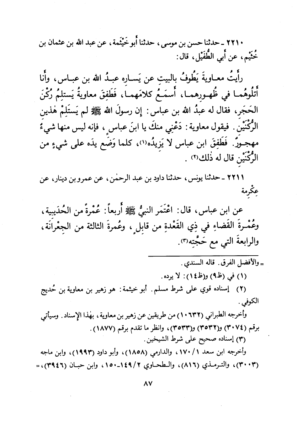 ٢٢١٠ - حَدَّثَنَا حَسَنُ بْنُ مُوسَى، حَدَّثَنَا أَبُو خَيْثَمَةَ، عَنْ عَبْدِ اللهِ بْنِ عُثْمَانَ بْنِ خُثَيْمٍ، عَنْ أَبِي الطُّفَيْلِ، قَالَ: رَأَيْتُ مُعَاوِيَةَ، يَطُوفُ بِالْبَيْتِ عَنْ يَسَارِهِ عَبْدُ اللهِ بْنُ عَبَّاسٍ، وَأَنَا أَتْلُوهُمَا، فِي ظُهُورِهِمَا، أَسْمَعُ كَلامَهُمَا فَطَفِقَ مُعَاوِيَةُ يَسْتَلِمُ رُكْنَ الْحَجَرِ، فَقَالَ لَهُ عَبْدُ اللهِ بْنُ عَبَّاسٍ: " إِنَّ رَسُولَ اللهِ صَلَّى اللهُ عَلَيْهِ وَسَلَّمَ، لَمْ يَسْتَلِمْ هَذَيْنِ الرُّكْنَيْنِ ". فَيَقُولُ مُعَاوِيَةُ: دَعْنِي مِنْكَ يَا ابْنَ عَبَّاسٍ، فَإِنَّهُ لَيْسَ مِنْهَا شَيْءٌ مَهْجُورٌ. فَطَفِقَ ابْنُ عَبَّاسٍ لَا يَزِيدُهُ، (١) كُلَّمَا وَضَعَ يَدَهُ عَلَى شَيْءٍ مِنَ الرُّكْنَيْنِ قَالَ لَهُ ذَلِكَ (٢)