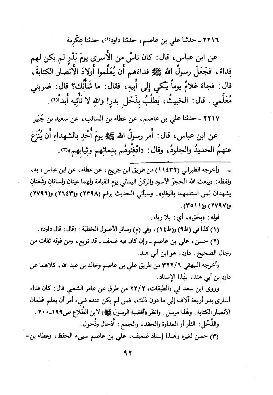 ٢٢١٦ - حَدَّثَنَا عَلِيُّ بْنُ عَاصِمٍ، حَدَّثَنَا دَاوُدُ (١) : حَدَّثَنَا عِكْرِمَةُ، عَنِ ابْنِ عَبَّاسٍ، قَالَ: " كَانَ نَاسٌ مِنَ الْأَسْرَى يَوْمَ بَدْرٍ لَمْ يَكُنْ لَهُمْ فِدَاءٌ، فَجَعَلَ رَسُولُ اللهِ صَلَّى اللهُ عَلَيْهِ وَسَلَّمَ، فِدَاءَهُمْ أَنْ يُعَلِّمُوا أَوْلَادَ الْأَنْصَارِ الْكِتَابَةَ " قَالَ: فَجَاءَ غُلَامٌ يَوْمًا يَبْكِي إِلَى أَبِيهِ، فَقَالَ: مَا شَأْنُكَ؟ قَالَ: ضَرَبَنِي مُعَلِّمِي قَالَ: الْخَبِيثُ، يَطْلُبُ بِذَحْلِ بَدْرٍ وَاللهِ لَا تَأْتِيهِ أَبَدًا (٢)