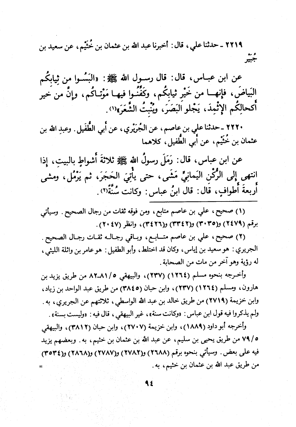 ٢٢١٩ - حَدَّثَنَا عَلِيٌّ، قَالَ: أَخْبَرَنَا عَبْدُ اللهِ بْنُ عُثْمَانَ بْنِ خُثَيْمٍ، عَنْ سَعِيدِ بْنِ جُبَيْرٍ، عَنِ ابْنِ عَبَّاسٍ، قَالَ: قَالَ رَسُولُ اللهِ صَلَّى اللهُ عَلَيْهِ وَسَلَّمَ: " الْبَسُوا مِنْ ثِيَابِكُمِ الْبَيَاضَ، فَإِنَّهَا مِنْ خَيْرِ ثِيَابِكُمْ، وَكَفِّنُوا فِيهَا مَوْتَاكُمْ، وَإِنَّ مِنْ خَيْرِ أَكْحَالِكُمُ الْإِثْمِدَ يَجْلُو الْبَصَرَ وَيُنْبِتُ الشَّعَرَ " (١)