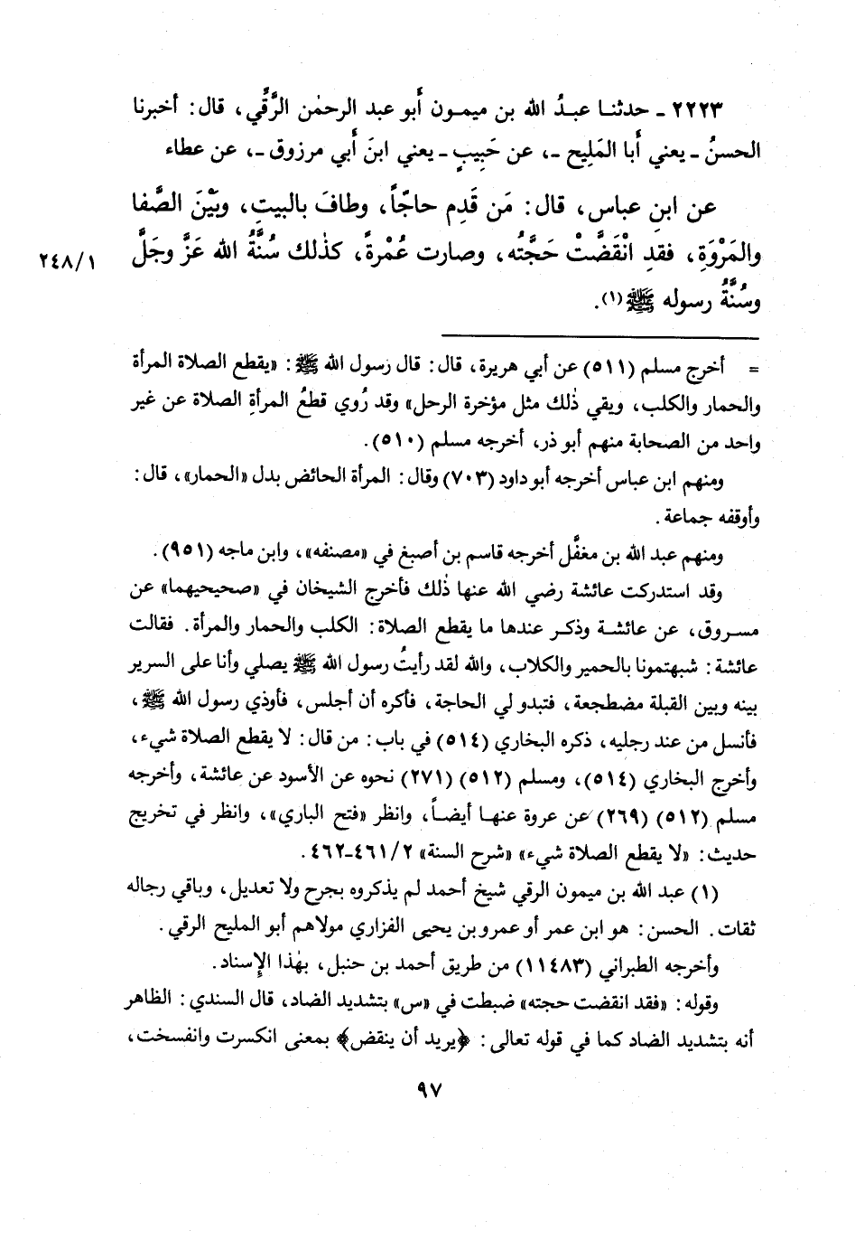 وقد استدركت عائشة رضي الله عنها ذلك فأخرج الشيخان في "صحيحيهما" عن مسروق، عن عائشة وذكر عندها ما يقطع الصلاة: الكلب والحمار والمرأة. فقالت عائشة: شبهتمونا بالحمير والكلاب، والله لقد رأيتُ رسول الله صَلَّى اللهُ عَلَيْهِ وَسَلَّمَ يصلي وأنا على السرير بينه وبين القبلة مضطجعة، فتبدو لي الحاجة، فأكره أن أجلس، فأوذي رسول الله صَلَّى اللهُ عَلَيْهِ وَسَلَّمَ، فأنسل من عند رجليه، ذكره البخاري (٥١٤) في باب: من قال: لا يقطع الصلاة شيء، وأخرج البخاري (٥١٤) ، ومسلم (٥١٢) (٢٧١) نحوه عن الأسود عن عائشة، وأخرجه مسلم (٥١٢) (٢٦٩) عن عروة عنها أيضاً، وانظر "فتح الباري"، وانظر في تخريج حديث: "لا يقطع الصلاة شيء" "شرح السنة" ٢/٤٦١-٤٦٢.