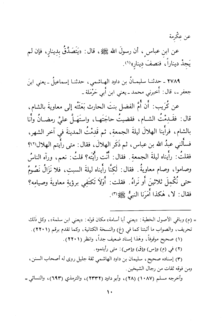 ٢٧٨٩ - حَدَّثَنَا سُلَيْمَانُ بْنُ دَاوُدَ الْهَاشِمِيُّ، حَدَّثَنَا إِسْمَاعِيلُ يَعْنِي ابْنَ جَعْفَرٍ، قَالَ: أَخْبَرَنِي مُحَمَّدٌ يَعْنِي ابْنَ أَبِي حَرْمَلَةَ، عَنْ كُرَيْبٍ: أَنَّ أُمَّ الْفَضْلِ بِنْتَ الْحَارِثِ بَعَثَتْهُ إِلَى مُعَاوِيَةَ بِالشَّامِ، قَالَ: فَقَدِمْتُ الشَّامَ، فَقَضَيْتُ حَاجَتَهَا، وَاسْتَهَلَّ عَلَيَّ رَمَضَانُ وَأَنَا بِالشَّامِ، فَرَأَيْنَا الْهِلالَ لَيْلَةَ الْجُمُعَةِ، ثُمَّ قَدِمْتُ الْمَدِينَةَ فِي آخِرِ الشَّهْرِ، فَسَأَلَنِي عَبْدُ اللهِ بْنُ عَبَّاسٍ، ثُمَّ ذَكَرَ الْهِلَالَ، فَقَالَ: مَتَى رَأَيْتُمُ الْهِلَالَ (٢) ؟ فَقُلْتُ: رَأَيْنَاهُ لَيْلَةَ الْجُمُعَةِ. فَقَالَ: أَنْتَ رَأَيْتَهُ؟ قُلْتُ: نَعَمْ، وَرَآهُ النَّاسُ وَصَامُوا، وَصَامَ مُعَاوِيَةُ. فَقَالَ: لَكِنَّا رَأَيْنَاهُ لَيْلَةَ السَّبْتِ، فَلَا نَزَالُ نَصُومُ حَتَّى نُكَمِّلَ ثَلَاثِينَ أَوْ نَرَاهُ. فَقُلْتُ: أَوَلَا تَكْتَفِي بِرُؤْيَةِ مُعَاوِيَةَ وَصِيَامِهِ؟ فَقَالَ: " لَا، هَكَذَا أَمَرَنَا النَّبِيُّ صَلَّى اللهُ عَلَيْهِ وَسَلَّمَ " (٣)