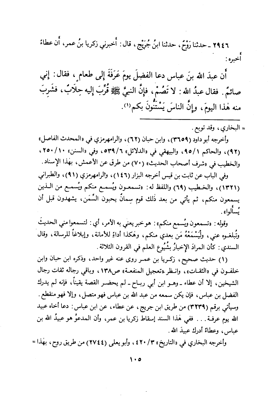 ٢٩٤٦ - حَدَّثَنَا رَوْحٌ، حَدَّثَنَا ابْنُ جُرَيْجٍ، قَالَ: أَخْبَرَنِي زَكَرِيَّا بْنُ عُمَرَ، أَنَّ عَطَاءً، أَخْبَرَهُ: أَنَّ عَبْدَ اللهِ بْنَ عَبَّاسٍ، دَعَا الْفَضْلَ يَوْمَ عَرَفَةَ إِلَى طَعَامٍ، فَقَالَ: إِنِّي صَائِمٌ. فَقَالَ عَبْدُ اللهِ: " لَا تَصُمْ، فَإِنَّ النَّبِيَّ صَلَّى اللهُ عَلَيْهِ وَسَلَّمَ، قُرِّبَ إِلَيْهِ حِلابٌ، فَشَرِبَ مِنْهُ هَذَا الْيَوْمَ، وَإِنَّ النَّاسَ يَسْتَنُّونَ بِكُمْ " (١)