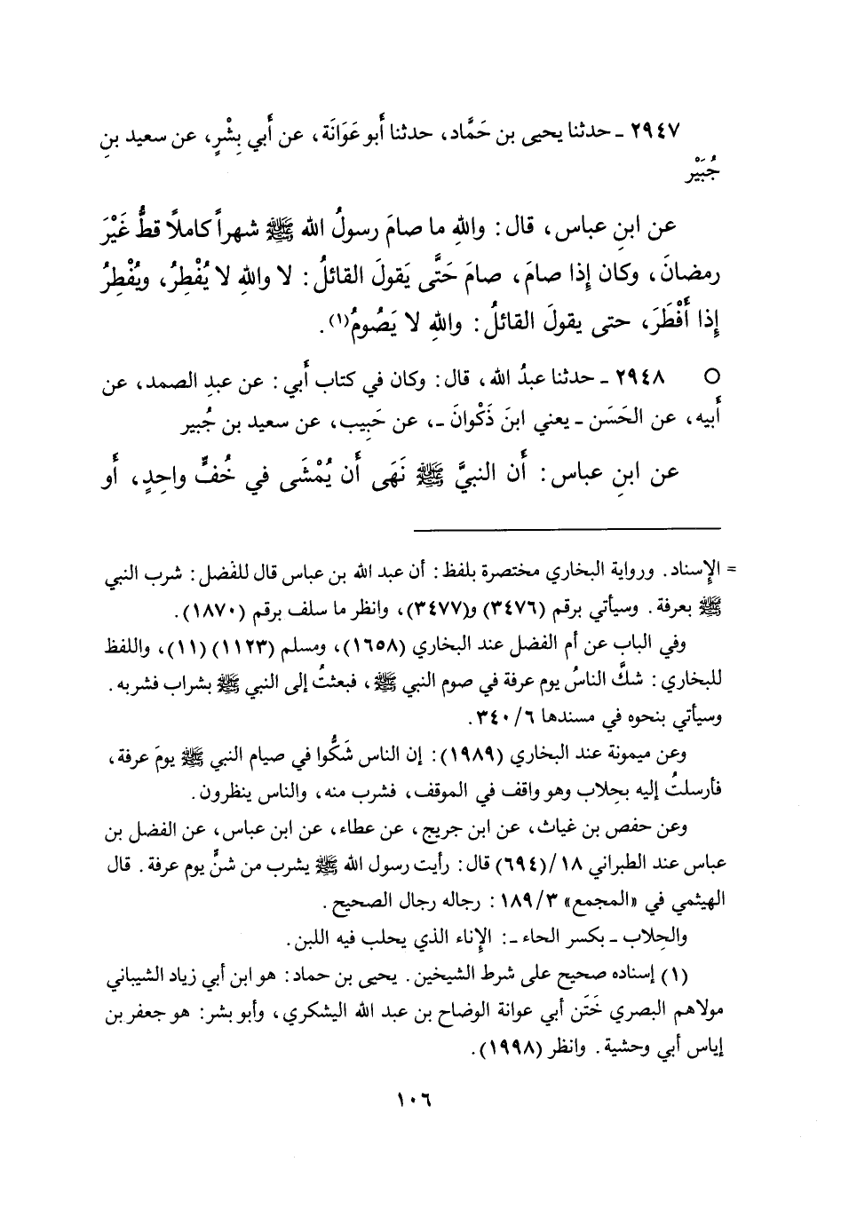 ٢٩٤٨ - عَنْ عَبْدِ الصَّمَدِ، عَنْ أَبِيهِ، عَنِ الْحَسَنِ يَعْنِي ابْنَ ذَكْوَانَ، عَنْ حَبِيبٍ، عَنْ سَعِيدِ بْنِ جُبَيْرٍ، عَنِ ابْنِ عَبَّاسٍ، أَنَّ النَّبِيَّ صَلَّى اللهُ عَلَيْهِ وَسَلَّمَ، " نَهَى أَنْ يُمْشَى فِي خُفٍّ وَاحِدٍ،