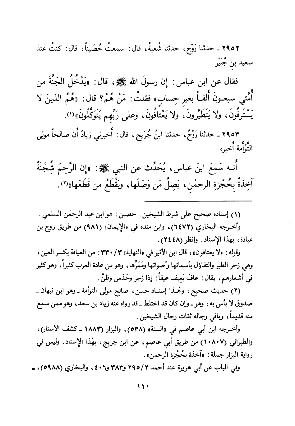 ٢٩٥٢ - حَدَّثَنَا رَوْحٌ، حَدَّثَنَا شُعْبَةُ، قَالَ: سَمِعْتُ حُصَيْنًا، قَالَ: كُنْتُ عِنْدَ سَعِيدِ بْنِ جُبَيْرٍ، فَقَالَ: عَنِ ابْنِ عَبَّاسٍ: أَنَّ رَسُولَ اللهِ صَلَّى اللهُ عَلَيْهِ وَسَلَّمَ قَالَ: " يَدْخُلُ الْجَنَّةَ مِنْ أُمَّتِي سَبْعُونَ أَلْفًا بِغَيْرِ حِسَابٍ " فَقُلْتُ: مَنْ هُمْ؟ فَقَالَ: " هُمِ الَّذِينَ لَا يَسْتَرْقُونَ، وَلا يَتَطَيَّرُونَ، وَلا يَعْتَافُونَ، وَعَلَى رَبِّهِمْ يَتَوَكَّلُونَ " (١)
