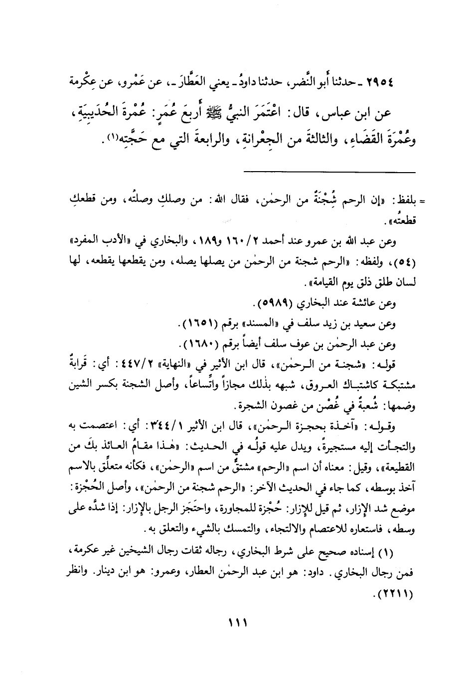 ٢٩٥٤ - حَدَّثَنَا أَبُو النَّضْرِ، حَدَّثَنَا دَاوُدُ يَعْنِي الْعَطَّارَ، عَنْ عَمْروٍ، عَنْ عِكْرِمَةَ، عَنِ ابْنِ عَبَّاسٍ، قَالَ: " اعْتَمَرَ النَّبِيُّ صَلَّى اللهُ عَلَيْهِ وَسَلَّمَ أَرْبَعَ عُمَرٍ: عُمْرَةَ الْحُدَيْبِيَةِ، وَعُمْرَةَ الْقَضَاءِ، وَالثَّالِثَةَ مِنَ الْجِعِرَّانَةِ، وَالرَّابِعَةَ الَّتِي مَعَ حَجَّتِهِ " (١)