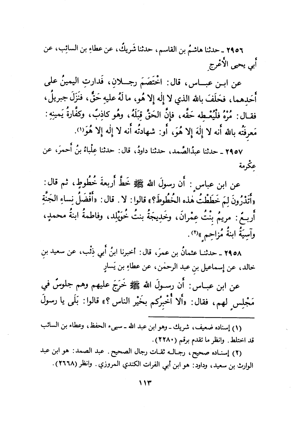 ٢٩٥٧ - حَدَّثَنَا عَبْدُ الصَّمَدِ، حَدَّثَنَا دَاوُدُ، قَالَ: حَدَّثَنَا عِلْبَاءُ بْنُ أَحْمَرَ، عَنْ عِكْرِمَةَ، عَنِ ابْنِ عَبَّاسٍ: أَنَّ رَسُولَ اللهِ صَلَّى اللهُ عَلَيْهِ وَسَلَّمَ خَطَّ أَرْبَعَةَ خُطُوطٍ، ثُمَّ قَالَ: " أَتَدْرُونَ لِمَ خَطَطْتُ هَذِهِ الْخُطُوطَ؟ " قَالُوا: لَا. قَالَ: " أَفْضَلُ نِسَاءِ الْجَنَّةِ أَرْبَعٌ: مَرْيَمُ بِنْتُ عِمْرَانَ، وَخَدِيجَةُ بِنْتُ خُوَيْلِدٍ، وَفَاطِمَةُ ابْنَةُ مُحَمَّدٍ، وَآسِيَةُ ابْنَةُ مُزَاحِمٍ " (٢)