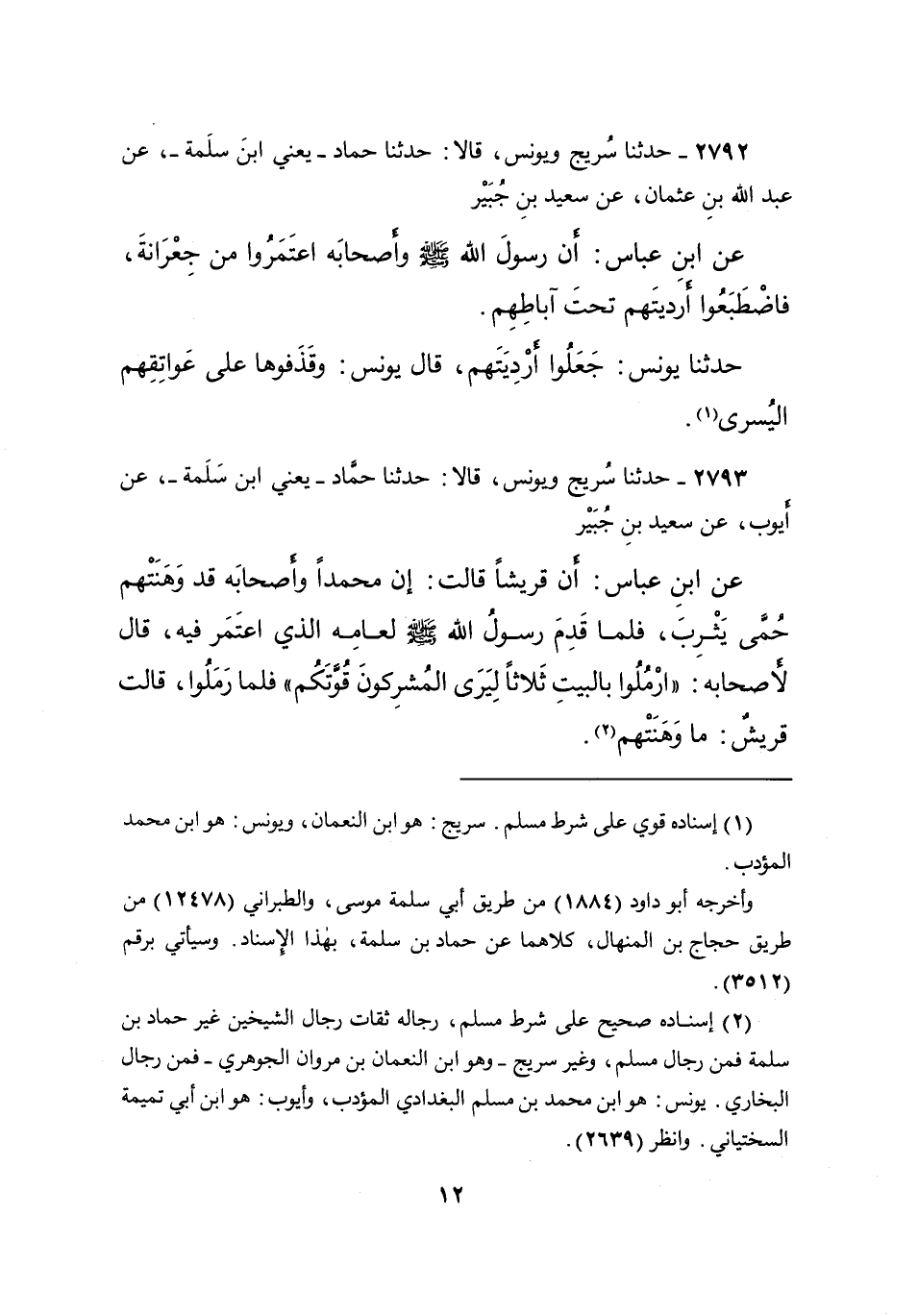 ٢٧٩٣ - حَدَّثَنَا سُرَيْجٌ، وَيُونُسُ، قَالا: حَدَّثَنَا حَمَّادٌ يَعْنِي ابْنَ سَلَمَةَ، عَنْ أَيُّوبَ، عَنْ سَعِيدِ بْنِ جُبَيْرٍ، عَنِ ابْنِ عَبَّاسٍ: أَنَّ قُرَيْشًا قَالَتْ: إِنَّ مُحَمَّدًا وَأَصْحَابَهُ قَدْ وَهَنَتْهُمْ حُمَّى يَثْرِبَ، فَلَمَّا قَدِمَ رَسُولُ اللهِ صَلَّى اللهُ عَلَيْهِ وَسَلَّمَ، لِعَامِهِ الَّذِي اعْتَمَرَ فِيهِ، قَالَ لِأَصْحَابِهِ: " ارْمُلُوا بِالْبَيْتِ ثَلاثًا لِيَرَى الْمُشْرِكُونَ قُوَّتَكُمْ " فَلَمَّا رَمَلُوا، قَالَتْ قُرَيْشٌ: مَا وَهَنَتْهُمْ (٢)
