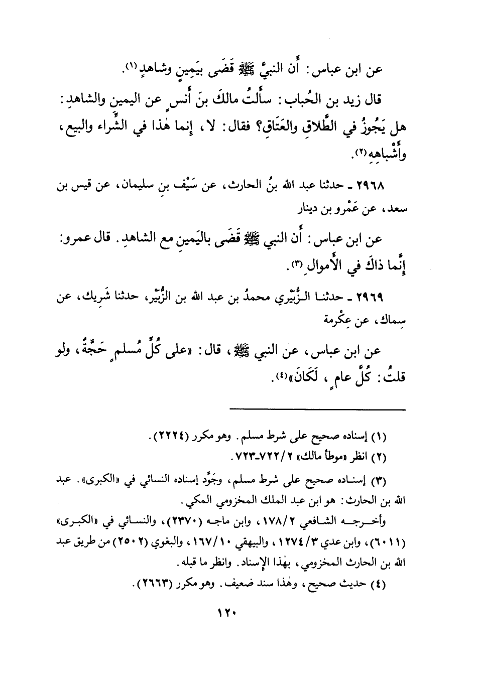 ٢٩٦٨ - حَدَّثَنَا عَبْدُ اللهِ بْنُ الْحَارِثِ، عَنْ سَيْفِ بْنِ سُلَيْمَانَ، عَنْ قَيْسِ بْنِ سَعْدٍ، عَنْ عَمْرِو بْنِ دِينَارٍ، عَنِ ابْنِ عَبَّاسٍ: أَنَّ النَّبِيَّ صَلَّى اللهُ عَلَيْهِ وَسَلَّمَ " قَضَى بِالْيَمِينِ مَعَ الشَّاهِدِ " قَالَ عَمْرٌو: " إِنَّمَا ذَاكَ فِي الْأَمْوَالِ " (٣)
