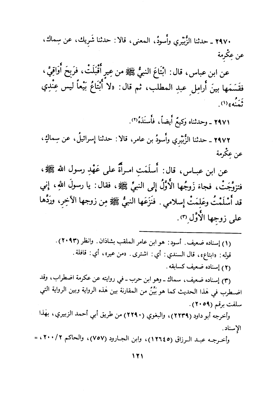 ٢٩٧٢ - حَدَّثَنَا الزُّبَيْرِيُّ، وَأَسْوَدُ بْنُ عَامِرٍ، قَالا: حَدَّثَنَا إِسْرَائِيلُ، عَنْ سِمَاكٍ، عَنْ عِكْرِمَةَ، عَنِ ابْنِ عَبَّاسٍ، قَالَ: أَسْلَمَتِ امْرَأَةٌ عَلَى عَهْدِ رَسُولِ اللهِ صَلَّى اللهُ عَلَيْهِ وَسَلَّمَ، فَتَزَوَّجَتْ، فَجَاءَ زَوْجُهَا الْأَوَّلُ إِلَى النَّبِيِّ صَلَّى اللهُ عَلَيْهِ وَسَلَّمَ، فَقَالَ: يَا رَسُولَ اللهِ، إِنِّي قَدْ أَسْلَمْتُ وَعَلِمَتَ إِسْلَامِي. " فَنَزَعَهَا النَّبِيُّ صَلَّى اللهُ عَلَيْهِ وَسَلَّمَ مِنْ زَوْجِهَا الْآخِرِ، وَرَدَّهَا عَلَى زَوْجِهَا الْأَوَّلِ " (٣)