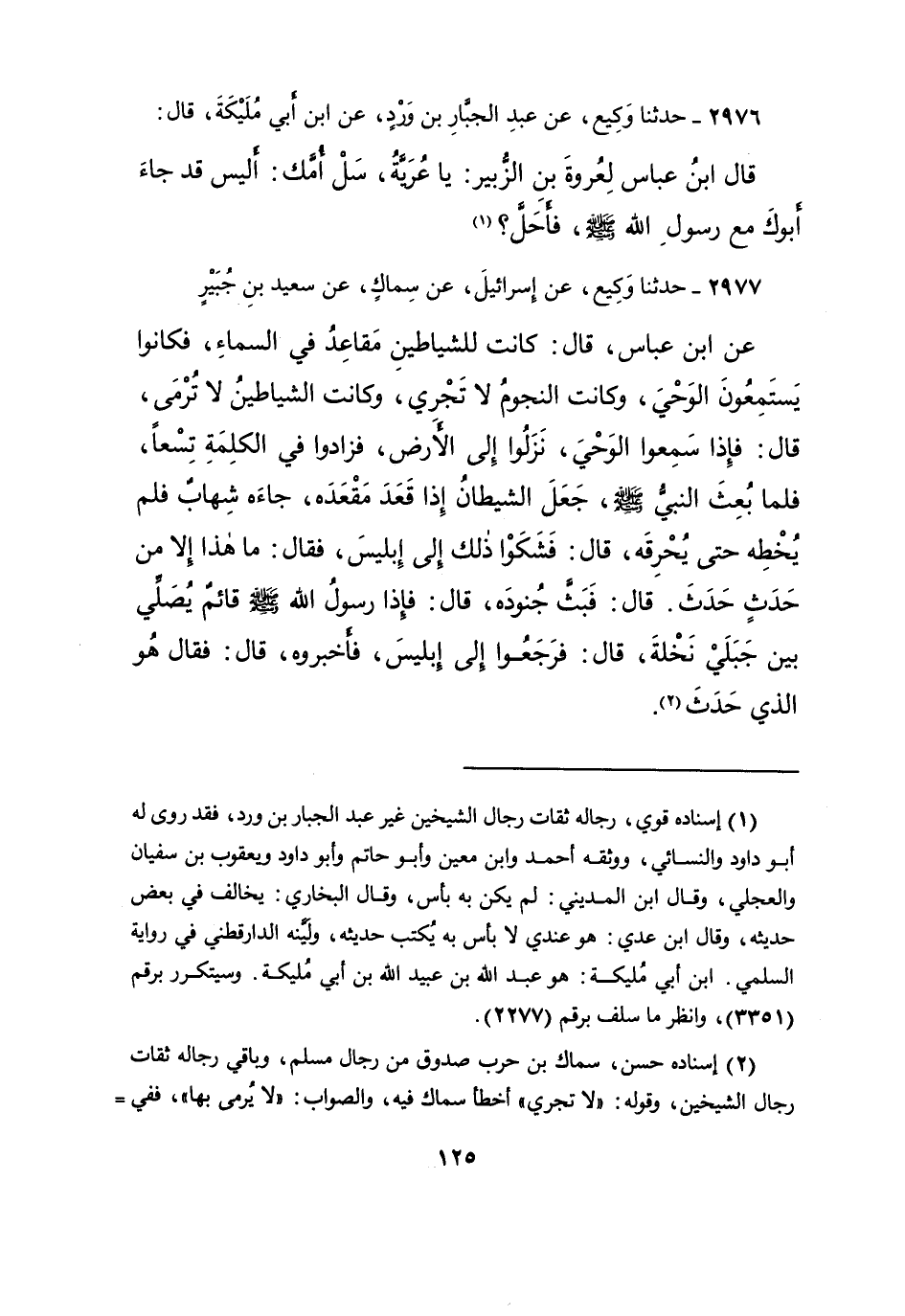 ٢٩٧٧ - حَدَّثَنَا وَكِيعٌ، عَنْ إِسْرَائِيلَ، عَنْ سِمَاكٍ، عَنْ سَعِيدِ بْنِ جُبَيْرٍ، عَنِ ابْنِ عَبَّاسٍ، قَالَ: كَانَتْ لِلشَّيَاطِينِ مَقَاعِدُ فِي السَّمَاءِ، فَكَانُوا يَسْتَمِعُونَ الْوَحْيَ، وَكَانَتِ النُّجُومُ لَا تَجْرِي، وَكَانَتِ الشَّيَاطِينُ لَا تُرْمَى، قَالَ: فَإِذَا سَمِعُوا الْوَحْيَ، نَزَلُوا إِلَى الْأَرْضِ، فَزَادُوا فِي الْكَلِمَةِ تِسْعًا، فَلَمَّا بُعِثَ النَّبِيُّ صَلَّى اللهُ عَلَيْهِ وَسَلَّمَ، جَعَلَ الشَّيْطَانُ إِذَا قَعَدَ مَقْعَدَهُ، جَاءَهُ شِهَابٌ فَلَمْ يَخْطُهُ حَتَّى يُحْرِقَهُ، قَالَ: فَشَكَوْا ذَلِكَ إِلَى إِبْلِيسَ، فَقَالَ: مَا هَذَا إِلا مِنْ حَدَثٍ حَدَثَ. قَالَ: فَبَثَّ جُنُودَهُ، قَالَ: " فَإِذَا رَسُولُ اللهِ صَلَّى اللهُ عَلَيْهِ وَسَلَّمَ قَائِمٌ يُصَلِّي بَيْنَ جَبَلَيْ نَخْلَةَ "، قَالَ: فَرَجَعُوا إِلَى إِبْلِيسَ، فَأَخْبَرُوهُ، قَالَ: فَقَالَ: هُوَ الَّذِي حَدَثَ (٢)