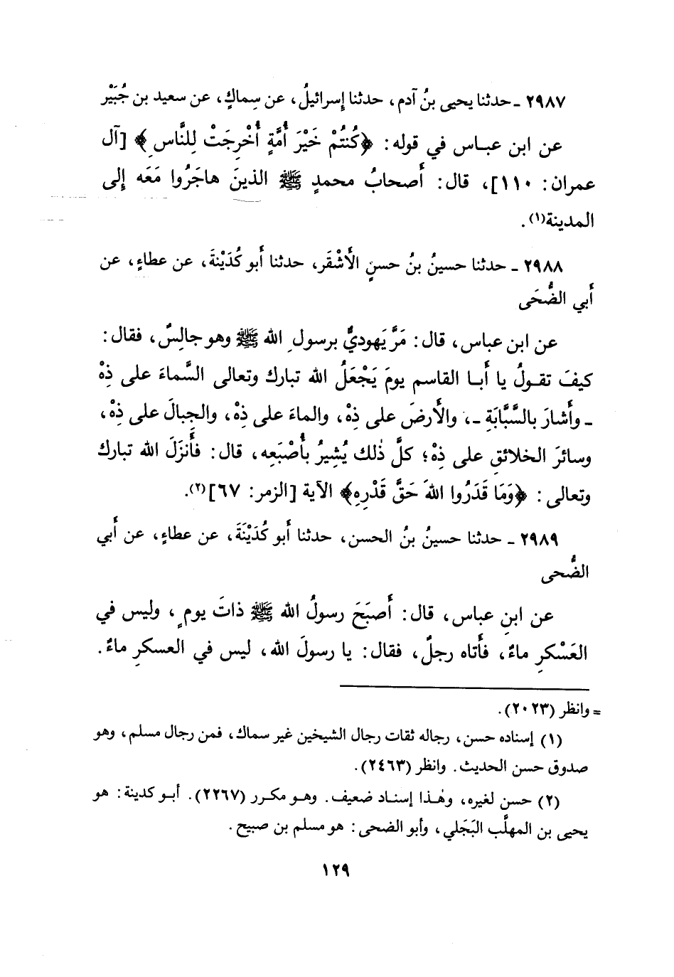 ٢٩٨٧ - حَدَّثَنَا يَحْيَى بْنُ آدَمَ، حَدَّثَنَا إِسْرَائِيلُ، عَنْ سِمَاكٍ، عَنْ سَعِيدِ بْنِ جُبَيْرٍ، عَنِ ابْنِ عَبَّاسٍ، فِي قَوْلِهِ: {كُنْتُمْ خَيْرَ أُمَّةٍ أُخْرِجَتْ لِلنَّاسِ} [آل عمران: ١١٠] ، قَالَ: " أَصْحَابُ مُحَمَّدٍ صَلَّى اللهُ عَلَيْهِ وَسَلَّمَ الَّذِينَ هَاجَرُوا مَعَهُ إِلَى الْمَدِينَةِ " (١)