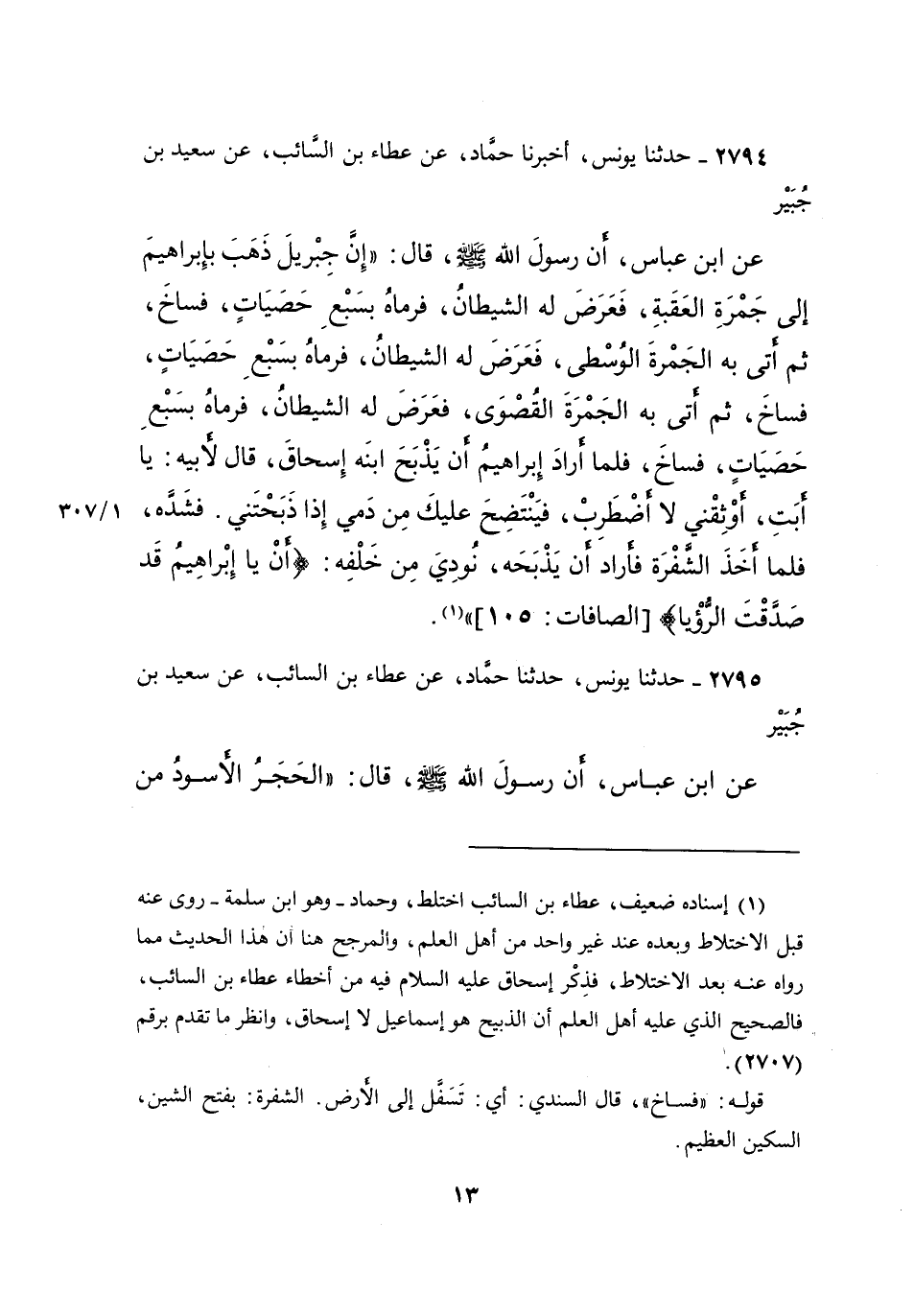 ٢٧٩٤ - حَدَّثَنَا يُونُسُ، أَخْبَرَنَا حَمَّادٌ، عَنْ عَطَاءِ بْنِ السَّائِبِ، عَنْ سَعِيدِ بْنِ جُبَيْرٍ، عَنِ ابْنِ عَبَّاسٍ، أَنَّ رَسُولَ اللهِ صَلَّى اللهُ عَلَيْهِ وَسَلَّمَ، قَالَ: " إِنَّ جِبْرِيلَ ذَهَبَ بِإِبْرَاهِيمَ إِلَى جَمْرَةِ الْعَقَبَةِ، فَعَرَضَ لَهُ الشَّيْطَانُ، فَرَمَاهُ بِسَبْعِ حَصَيَاتٍ، فَسَاخَ، ثُمَّ أَتَى بِهِ الْجَمْرَةَ الْوُسْطَى، فَعَرَضَ لَهُ الشَّيْطَانُ، فَرَمَاهُ بِسَبْعِ حَصَيَاتٍ، فَسَاخَ، ثُمَّ أَتَى بِهِ الْجَمْرَةَ الْقُصْوَى، فَعَرَضَ لَهُ الشَّيْطَانُ، فَرَمَاهُ بِسَبْعِ حَصَيَاتٍ، فَسَاخَ، فَلَمَّا أَرَادَ إِبْرَاهِيمُ أَنْ يَذْبَحَ ابْنَهُ إِسْحَاقَ، قَالَ لِأَبِيهِ: يَا أَبَتِ، أَوْثِقْنِي لَا أَضْطَرِبُ، فَيَنْتَضِحَ عَلَيْكَ مِنْ دَمِي إِذَا ذَبَحْتَنِي. فَشَدَّهُ، فَلَمَّا أَخَذَ الشَّفْرَةَ فَأَرَادَ أَنْ يَذْبَحَهُ، نُودِيَ مِنْ خَلْفِهِ: {أَنْ يَا إِبْرَاهِيمُ قَدْ صَدَّقْتَ الرُّؤْيَا} [الصافات: ١٠٥] " (١)