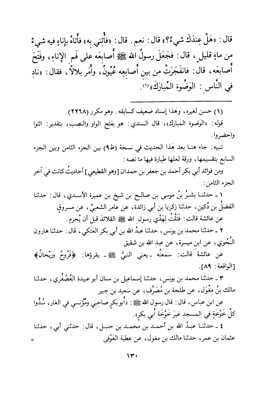 تنبيه: جاء هنا بعد هذا الحديث في نسخة (ظ٩) بين الجزء الثامن وبين الجزء السابع بتقسيمها، ورقة لعلها طيارة فيها ما نصه: ومن فوائد أبي بكر أحمد بن جعفر بن حمدان] وهو القطيعي [أحاديثُ كانت في آخر الجزء الثامن: