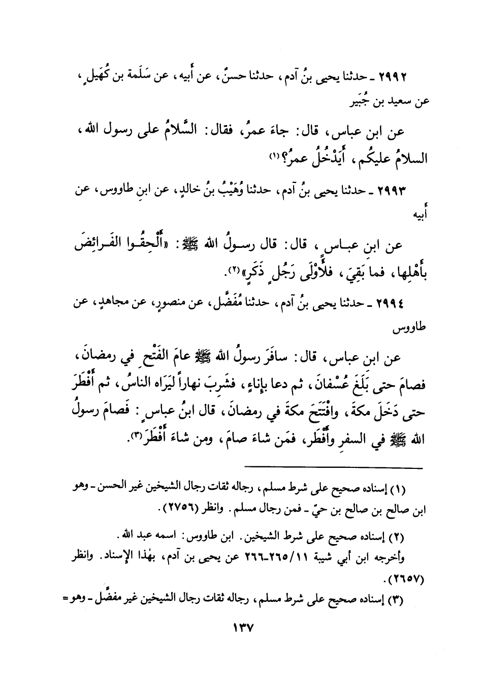 ٢٩٩٣ - حَدَّثَنَا يَحْيَى بْنُ آدَمَ، حَدَّثَنَا وُهَيْبُ بْنُ خَالِدٍ، عَنِ ابْنِ طَاوُسٍ، عَنْ أَبِيهِ، عَنِ ابْنِ عَبَّاسٍ، قَالَ: قَالَ رَسُولُ اللهِ صَلَّى اللهُ عَلَيْهِ وَسَلَّمَ: " أَلْحِقُوا الْفَرَائِضَ بِأَهْلِهَا، فَمَا بَقِيَ، فَلِأَوْلَى رَجُلٍ ذَكَرٍ " (٢)