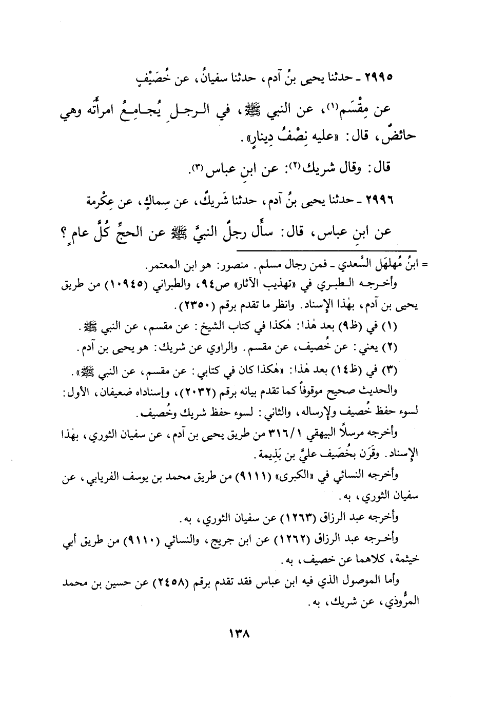 ٢٩٩٥ - حَدَّثَنَا يَحْيَى بْنُ آدَمَ، حَدَّثَنَا سُفْيَانُ، عَنْ خُصَيْفٍ، عَنْ مِقْسَمٍ (١) ، عَنِ النَّبِيِّ صَلَّى اللهُ عَلَيْهِ وَسَلَّمَ فِي الرَّجُلِ يُجَامِعُ امْرَأَتَهُ وَهِيَ حَائِضٌ، قَالَ: " عَلَيْهِ نِصْفُ دِينَارٍ " قَالَ: وَقَالَ شَرِيكٌ (٢) : عَنِ ابْنِ عَبَّاسٍ (٣) .