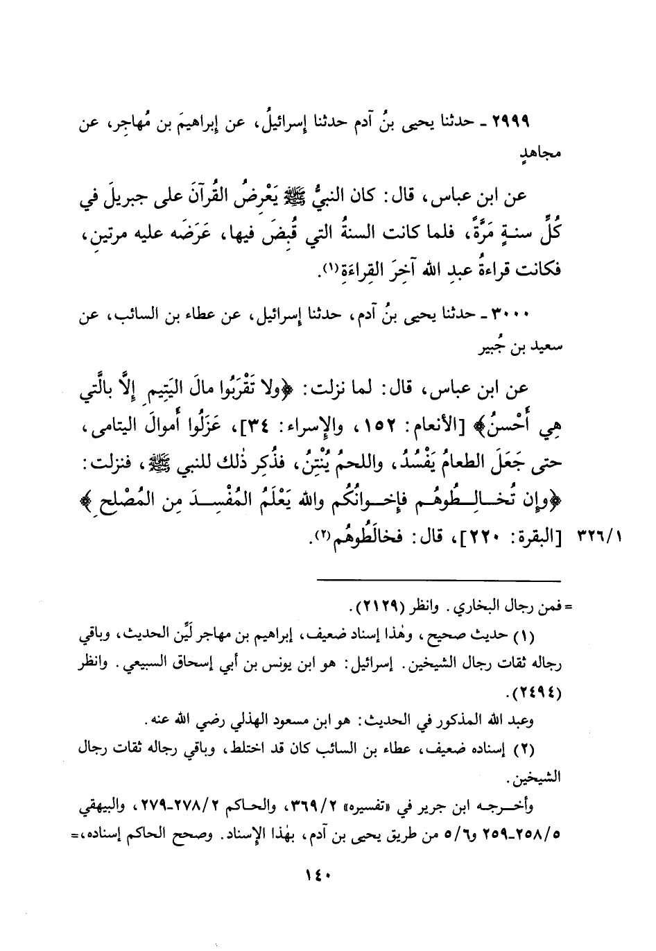 ٢٩٩٩ - حَدَّثَنَا يَحْيَى بْنُ آدَمَ، حَدَّثَنَا إِسْرَائِيلُ، عَنْ إِبْرَاهِيمَ بْنِ مُهَاجِرٍ، عَنْ مُجَاهِدٍ، عَنِ ابْنِ عَبَّاسٍ، قَالَ: " كَانَ النَّبِيُّ صَلَّى اللهُ عَلَيْهِ وَسَلَّمَ يَعْرِضُ الْقُرْآنَ عَلَى جِبْرِيلَ فِي كُلِّ سَنَةٍ مَرَّةً، فَلَمَّا كَانَتِ السَّنَةُ الَّتِي قُبِضَ فِيهَا، عَرَضَهُ عَلَيْهِ مَرَّتَيْنِ "، فَكَانَتْ قِرَاءَةُ عَبْدِ اللهِ آخِرَ الْقِرَاءَةِ (١)