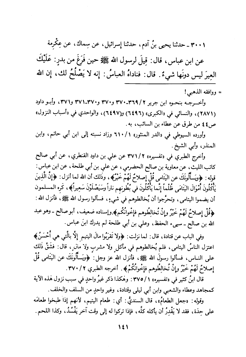 وأخرج الطبري في "تفسيره" ٢/٣٧١ عن علي بن داود القنطري، عن أبي صالح كاتب الليث، عن معاوية بن صالح الحضرمي، عن علي بن أبي طلحة، عن ابن عباس: قوله: (ويَسألونَكَ عن اليَتَامى قُلْ إصلاح لَهُمْ خَيْر) ، وذلك أن الله لما أنزل: (إِن الذِينَ يَأكُلُونَ أمْوَالَ اليَتَامَى ظُلْما إنَما يَأكُلُونَ في بُطُونهِم ناراً وسَيَصْلَوْنَ سَعِيراً) ، كَرِه المسلمون أن يضموا اليتامى، وتحرَّجوا أن يُخالطوهم في شيءٍ، فسألوا رسول الله صَلَّى اللهُ عَلَيْهِ وَسَلَّمَ، فأنزل الله: (قُلْ إصلاح لَهُمْ خَيْر وإنْ تُخالِطُوهم فإخْوانُكُ) . وإسناده ضعيف، أبو صالح- وهو عبد الله بن صالح- سيىء الحفظ، وعلي بن أبي طلحة لم يدرك ابن عباس.