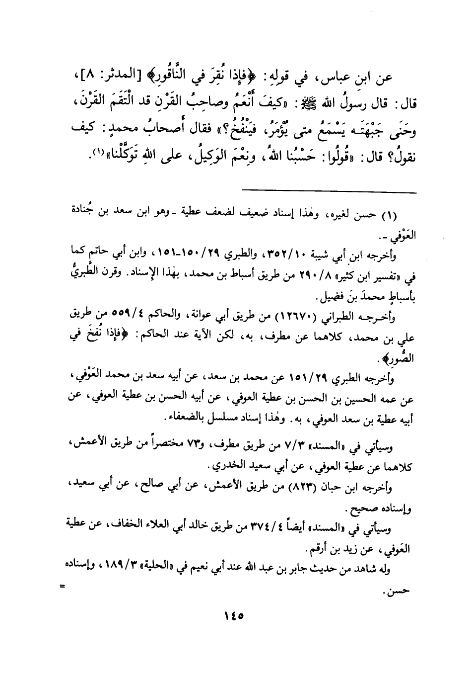 عَنِ ابْنِ عَبَّاسٍ، فِي قَوْلِهِ: {فَإِذَا نُقِرَ فِي النَّاقُورِ} [المدثر: ٨] قَالَ: قَالَ رَسُولُ اللهِ صَلَّى اللهُ عَلَيْهِ وَسَلَّمَ: " كَيْفَ أَنْعَمُ وَصَاحِبُ الْقَرْنِ قَدِ الْتَقَمَ الْقَرْنَ، وَحَنَى جَبْهَتَهُ يَسَّمَّعُ مَتَى يُؤْمَرُ، فَيَنْفُخُ؟ " فَقَالَ أَصْحَابُ مُحَمَّدٍ: كَيْفَ نَقُولُ؟ قَالَ: " قُولُوا: حَسْبُنَا اللهُ، وَنِعْمَ الْوَكِيلُ، عَلَى اللهِ تَوَكَّلْنَا " (١)
