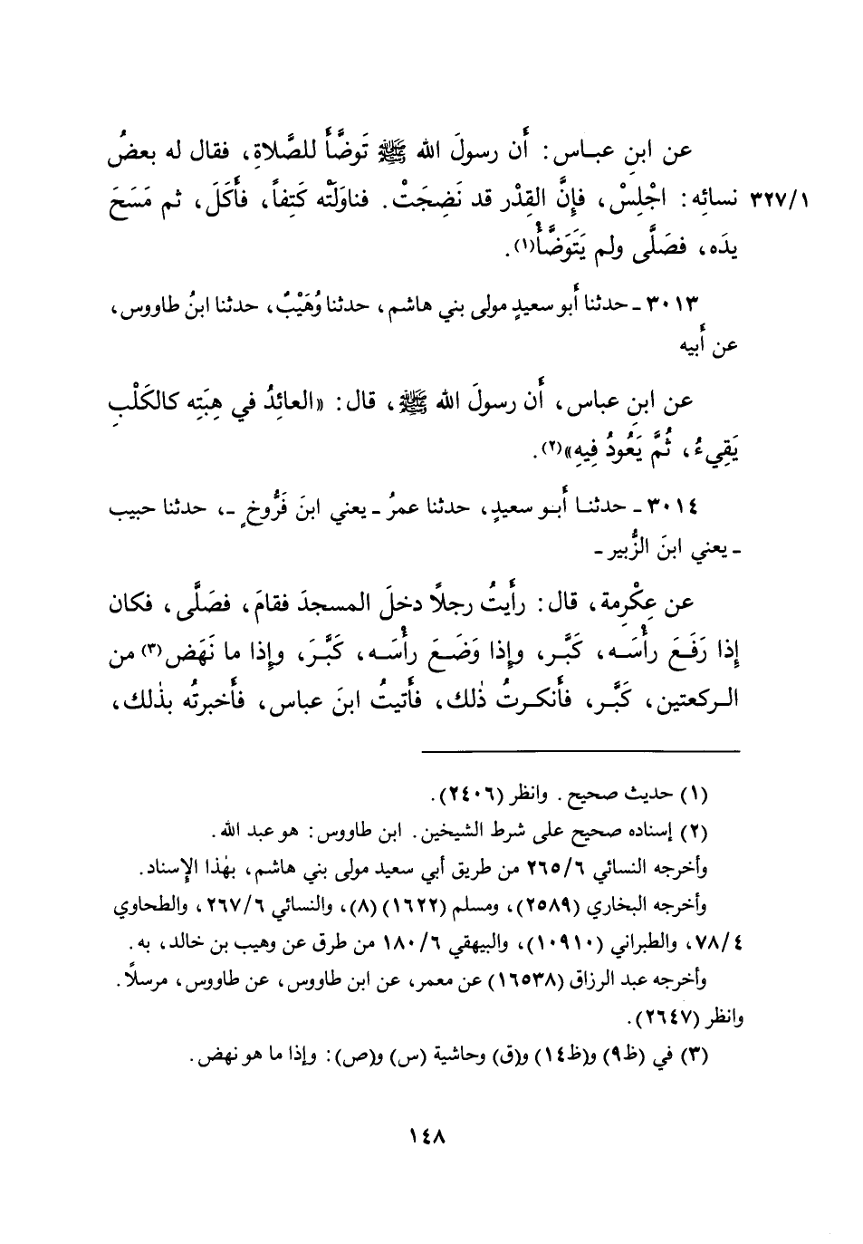 ٣٠١٣ - حَدَّثَنَا أَبُو سَعِيدٍ، مَوْلَى بَنِي هَاشِمٍ، حَدَّثَنَا وُهَيْبٌ، حَدَّثَنَا ابْنُ طَاوُسٍ، عَنْ أَبِيهِ، عَنِ ابْنِ عَبَّاسٍ، أَنَّ رَسُولَ اللهِ صَلَّى اللهُ عَلَيْهِ وَسَلَّمَ قَالَ: " الْعَائِدُ فِي هِبَتِهِ كَالْكَلْبِ يَقِيءُ، ثُمَّ يَعُودُ فِيهِ " (٢)