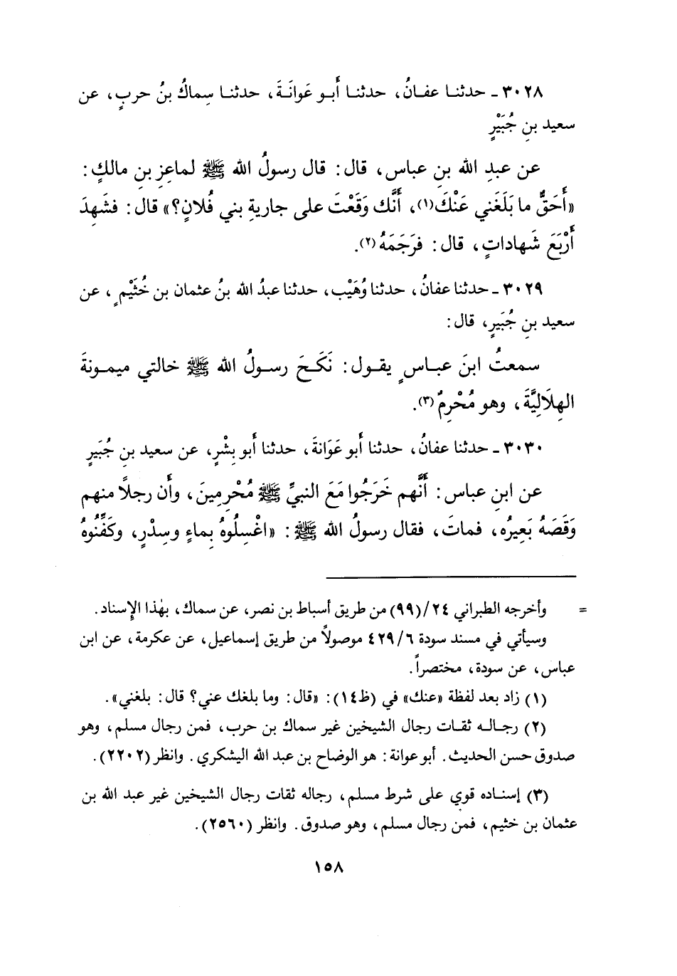 ٣٠٢٨ - حَدَّثَنَا عَفَّانُ، حَدَّثَنَا أَبُو عَوَانَةَ، حَدَّثَنَا سِمَاكُ بْنُ حَرْبٍ، عَنْ سَعِيدِ بْنِ جُبَيْرٍ، عَنْ عَبْدِ اللهِ بْنِ عَبَّاسٍ، قَالَ: قَالَ رَسُولُ اللهِ صَلَّى اللهُ عَلَيْهِ وَسَلَّمَ لِمَاعِزِ بْنِ مَالِكٍ: " أَحَقٌّ مَا بَلَغَنِي عَنْكَ (١) ، أَنَّكَ وَقَعْتَ عَلَى جَارِيَةِ بَنِي فُلانٍ؟ " قَالَ: فَشَهِدَ أَرْبَعَ شَهَادَاتٍ، قَالَ: فَرَجَمَهُ (٢) .