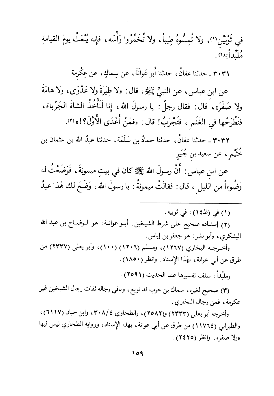٣٠٣١ - حَدَّثَنَا عَفَّانُ، حَدَّثَنَا أَبُو عَوَانَةَ، عَنْ سِمَاكٍ، عَنْ عِكْرِمَةَ، عَنِ ابْنِ عَبَّاسٍ، أَنَّ النَّبِيَّ صَلَّى اللهُ عَلَيْهِ وَسَلَّمَ قَالَ: " لَا طِيَرَةَ وَلا عَدْوَى، وَلا هَامَةَ وَلا صَفَرَ "، قَالَ: فَقَالَ رَجُلٌ: يَا رَسُولَ اللهِ، إِنَّا لَنَأْخُذُ الشَّاةَ الْجَرْبَاءَ، فَنَطْرَحُهَا فِي الْغَنَمِ، فَتَجْرَبُ قَالَ: " فَمَنْ أَعْدَى الْأَوَّلَ " (٣)