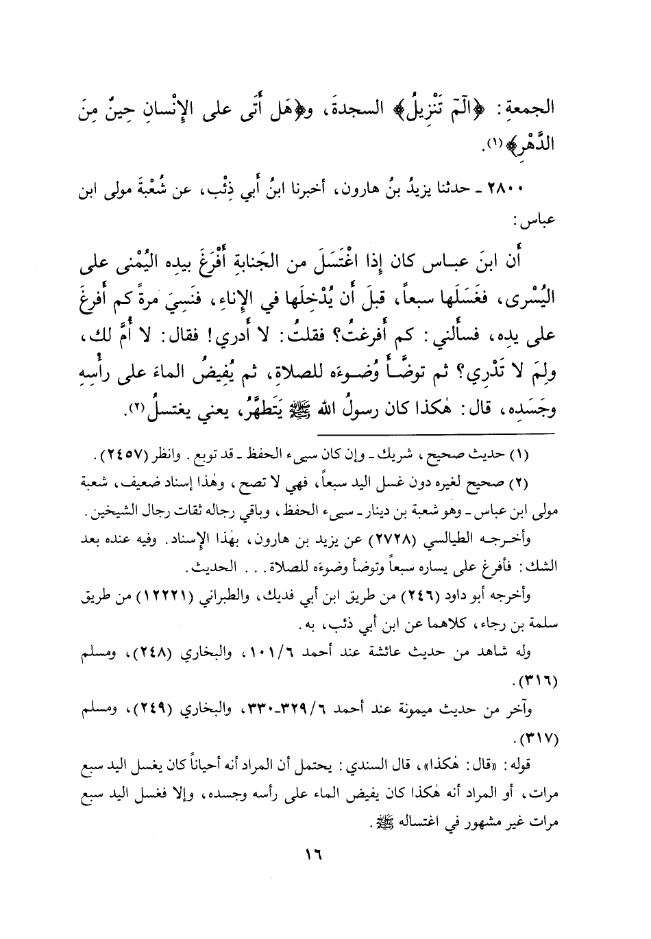 ٢٨٠٠ - حَدَّثَنَا يَزِيدُ بْنُ هَارُونَ، أَخْبَرَنَا ابْنُ أَبِي ذِئْبٍ، عَنْ شُعْبَةَ، مَوْلَى ابْنِ عَبَّاسٍ، أَنَّ ابْنَ عَبَّاسٍ، كَانَ إِذَا اغْتَسَلَ مِنَ الجَنَابَةِ أَفْرَغَ بِيَدِهِ الْيُمْنَى عَلَى الْيُسْرَى، فَغَسَلَهَا سَبْعًا، قَبْلَ أَنْ يُدْخِلَهَا فِي الْإِنَاءِ، فَنَسِيَ مَرَّةً كَمْ أَفْرَغَ عَلَى يَدِهِ، فَسَأَلَنِي: كَمْ أَفْرَغْتُ؟ فَقُلْتُ: لَا أَدْرِي فَقَالَ: لَا أُمَّ لَكَ، وَلِمَ لَا تَدْرِي؟ ثُمَّ تَوَضَّأَ وُضُوءَهُ لِلصَّلاةِ، ثُمَّ يُفِيضُ الْمَاءَ عَلَى رَأْسِهِ وَجَسَدِهِ، قَالَ: " هَكَذَا كَانَ رَسُولُ اللهِ صَلَّى اللهُ عَلَيْهِ وَسَلَّمَ يَتَطَهَّرُ، يَعْنِي يَغْتَسِلُ " (٢)